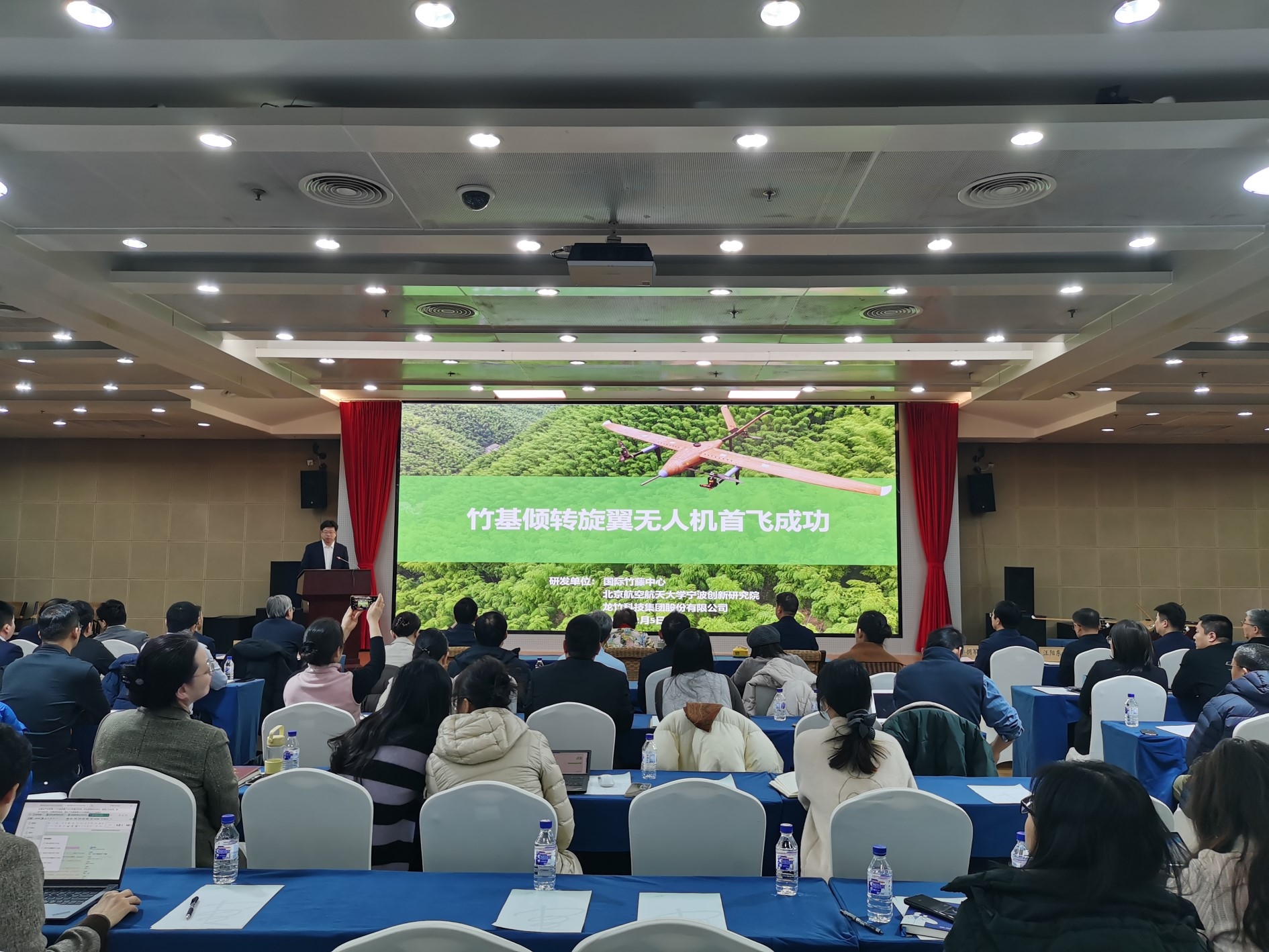 2月5日,竹基倾转旋翼无人机成果推介会在京召开。由国际竹藤中心(以下简称“中心”)牵头,联合北京航空航天大学宁波创新研究院、龙竹科技集团股份有限公司共同研发的竹基倾转旋翼无人机,日前在天津欢喜机场成功完成首飞。国家林草局相关司局负责同志、三方合作单位代表及多家主流媒体共同见证这一绿色航空创新成果的正式亮相,标志着竹基复合材料在航空飞行器领域实现重要技术突破。