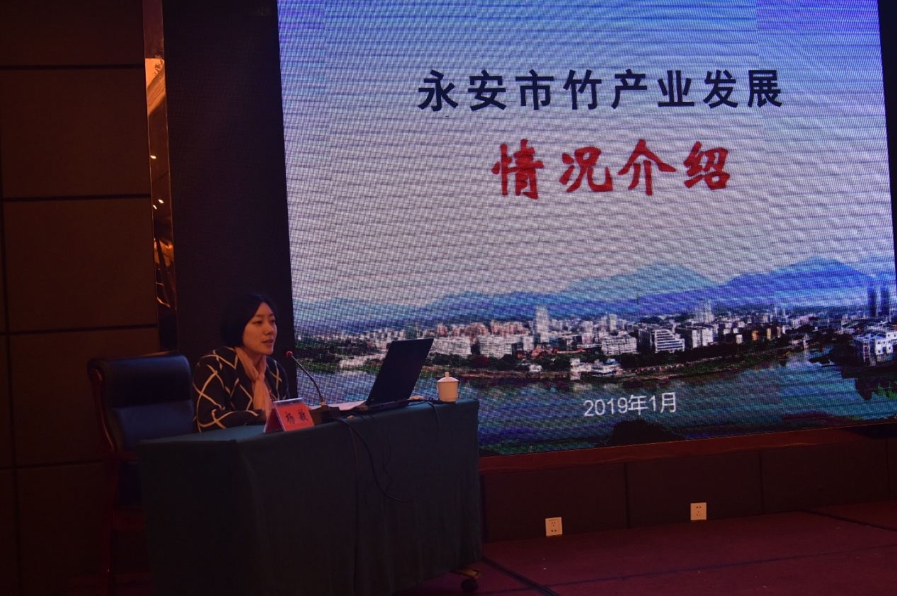 典型发言环节,永安市林业局副局长杨敏介绍永安竹产业发展情况