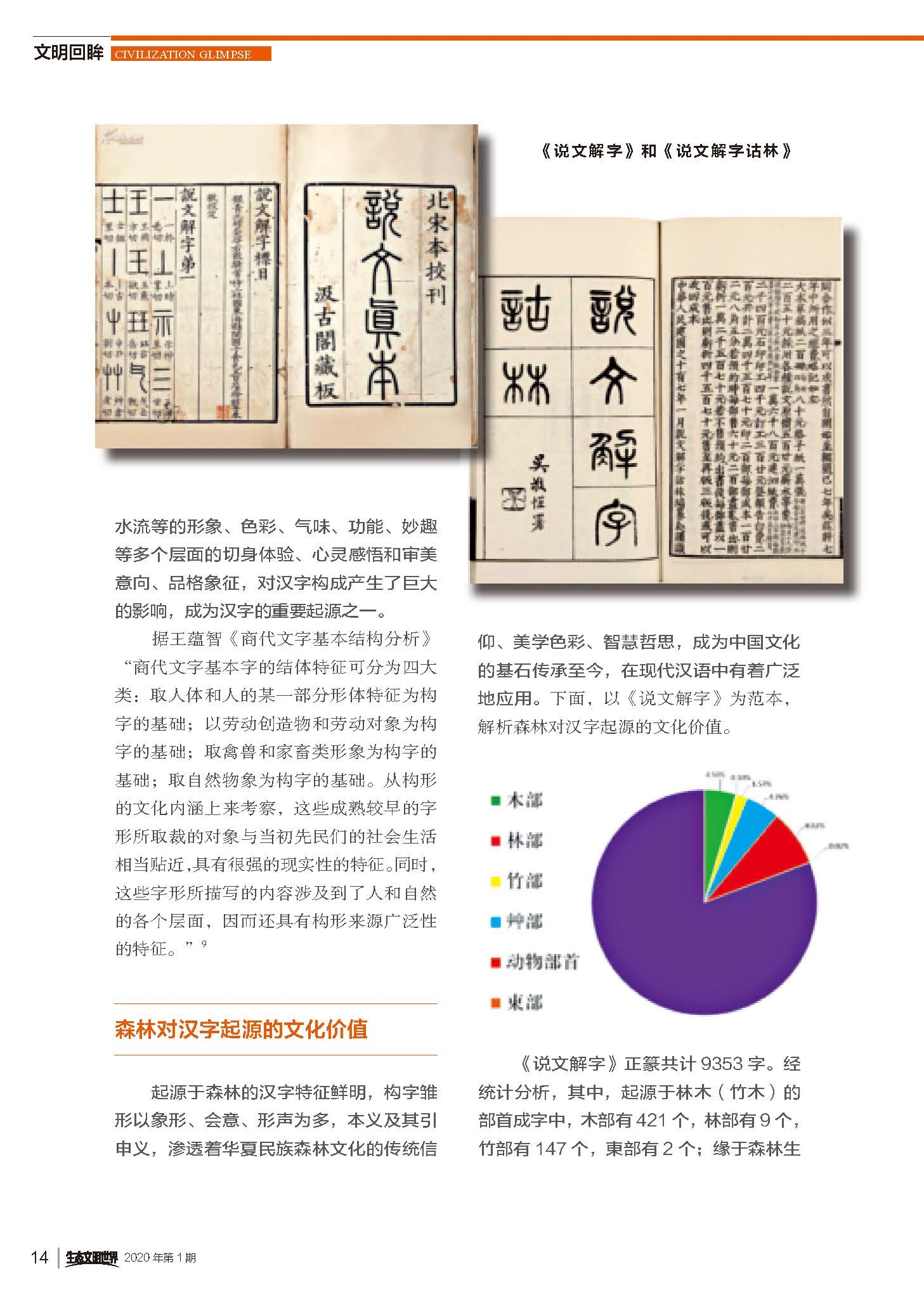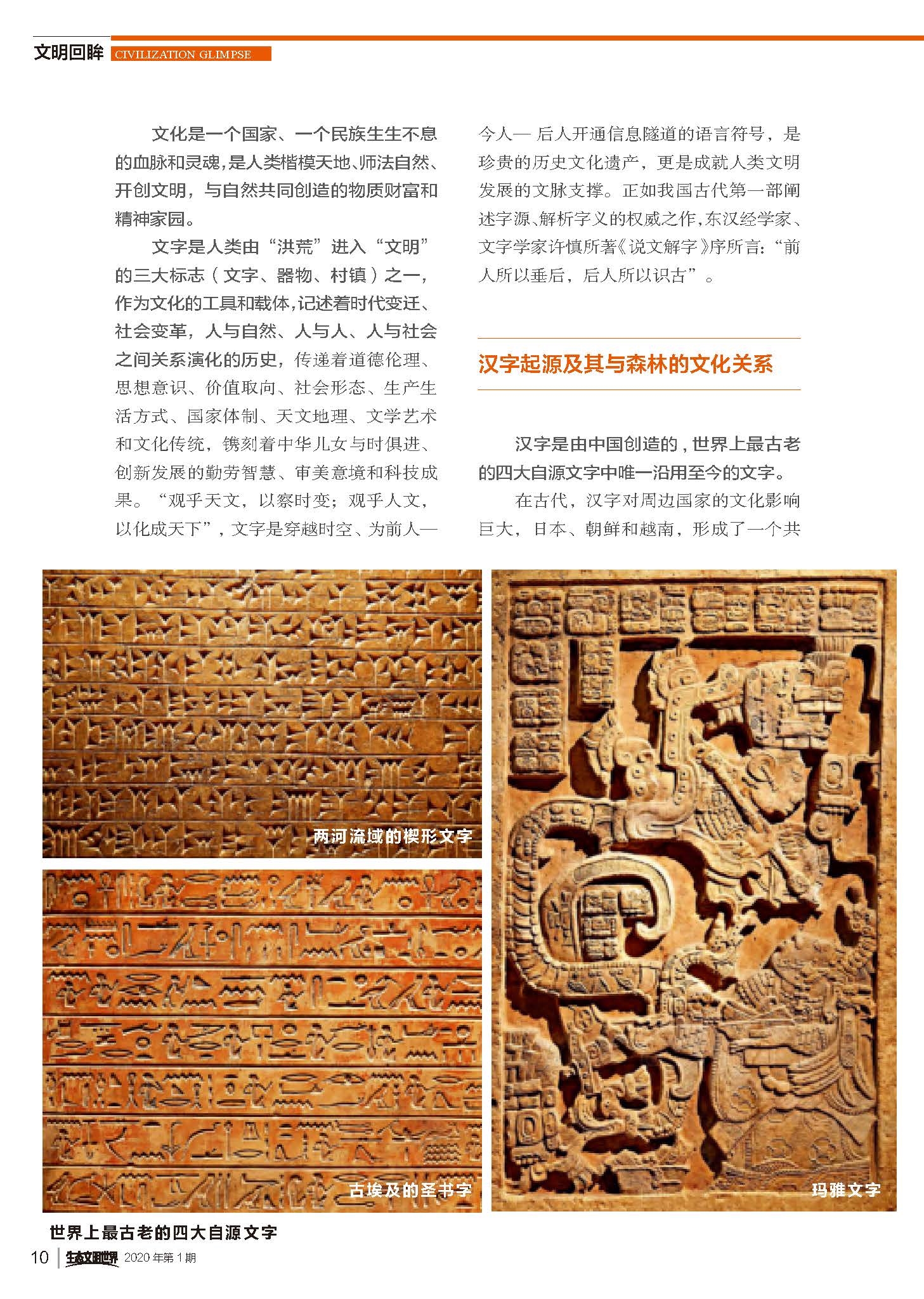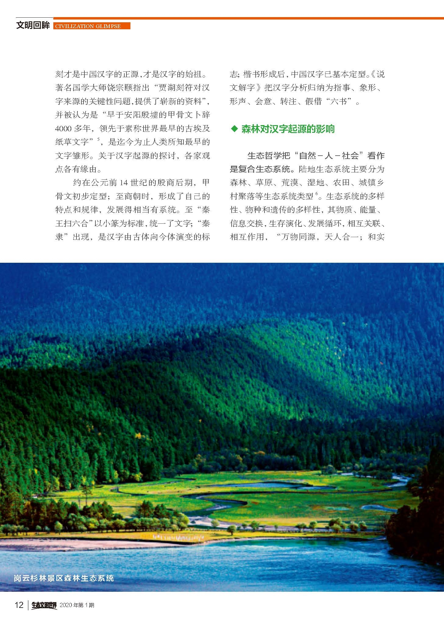 学习贯彻党的十九届四中全会精神: 推进中华优秀传统文化传承发展工程, 加强中国历史和中华文化教, 坚持不懈开展马克思主义祖国观、民族观、文化观、历史观宣传教育, 打牢中华民族共同体思想基础, 构筑中国精神、中国价值、中国力量。森林文化植根中国大地,是创造中华文化的重要基础。解析森林对汉字起源的影响, 关乎森林文化遗产保护传承和创新发展; 溯源森林对人类文明发展的文化价值, 揭示中华民族屹立于世界民族之林,和谐、可持续发展的文化品格和思想精髓, 至关人类的古今和未来……