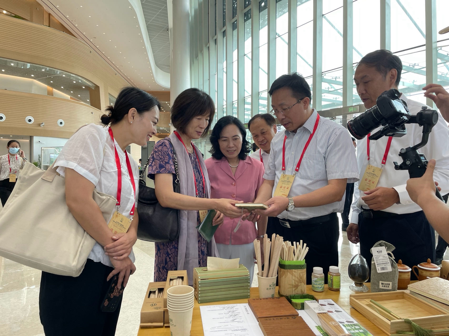 会议期间,中心通过展板和实物展示、成果手册发放、视频播放、现场讲解等方式,集中展示了“以竹代塑”科技创新成果,吸引了众多与会人员关注。此外,王戈研究员、方长华研究员分别在主题报告会和专题研讨会上作了主题演讲。