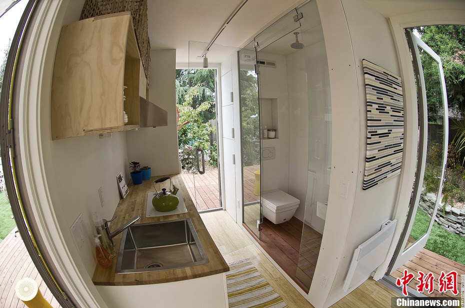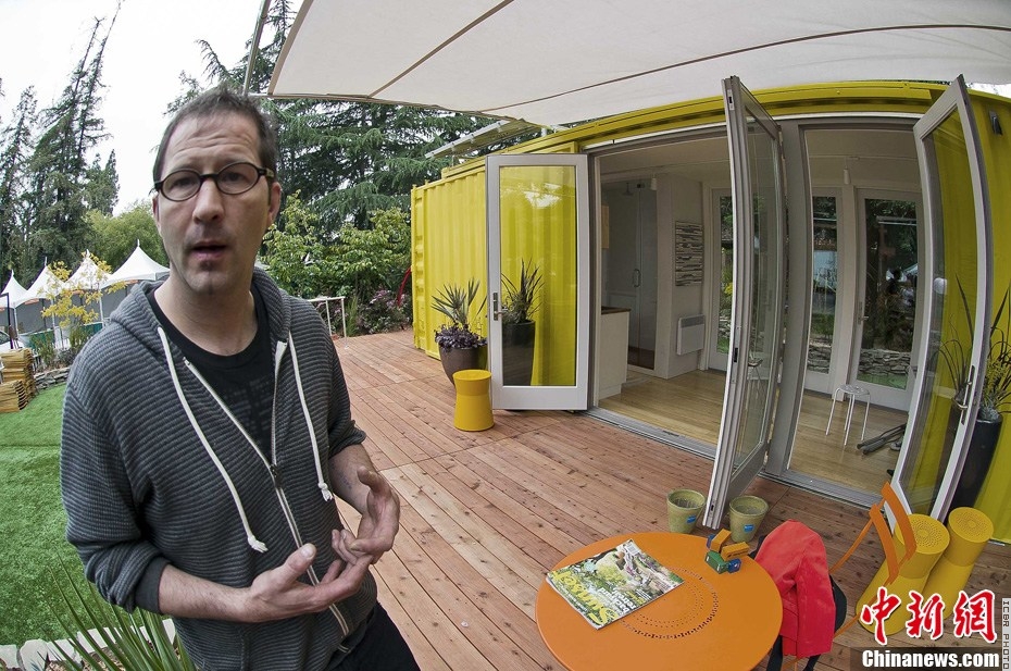 当地时间6月3日,美国加州门罗公园市,由家居生活杂志《日落》举办的年度周末庆会上,一座远道而来的集装箱房屋售价5.9万美元,成为今年隆重推出的的概念房。它鲜艳的明黄色、雅致时尚的室内设计以及一应俱全的生活用具吸引众人眼球。总共17.84平方米的空间,最多可供4人生活。地上铺竹木地板,房屋一侧有上下两张可折叠双人床,下面收起后即是沙发,上面收起后可做装饰墙板。另一侧是设备齐全的厨房和卫生间,屋顶架设的太阳能面板提供用电和热水,生活用水由污水净化系统处理。中间小小的客厅兼具餐厅和书房的功能。房屋南北通透,6面落地玻璃门直通向外接的红木地板露台和前后院。如果不是房屋两侧硕大的金属插锁,恐怕无人会把这座可爱的小房子与笨重的集装箱联系在一起。