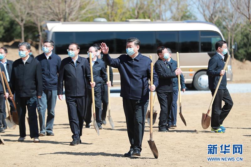 4月3日,党和国家领导人习近平、李克强、栗战书、汪洋、王沪宁、赵乐际、韩正、王岐山等来到北京市大兴区旧宫镇参加首都义务植树活动。这是习近平拿起铁锹走向植树地点,向正在植树的干部群众挥手致意。 新华社记者 丁海涛 摄
