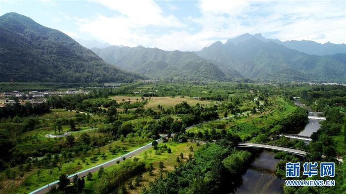 西安市长安区秦岭违建别墅“群贤别业”拆除后建设的秦岭和谐森林公园(7月26日无人机拍摄)。新华社记者 刘潇 摄