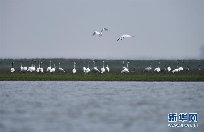 一群小天鹅在东洞庭湖国家级自然保护区内聚集(2018年2月26日摄)。近年来,湖南自上而下发动省、市、县、乡、村五级干部打“洞庭湖生态环境保卫战”。新华社记者 李尕 摄