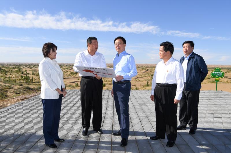 8月26日至27日,中共中央政治局常委、国务院副总理韩正到内蒙古自治区鄂尔多斯市,就库布其沙漠防沙治沙和生态建设情况进行调研。这是8月27日,韩正来到位于库布其沙漠腹地的沙峰绿谷,实地查看科技手段治沙成果。新华社记者 张领 摄