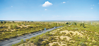 如今,驾车行驶在这条穿沙公路,昔日的沙障网格已不见踪影,取而代之的是几公里宽的绿色植被。老百姓通过修路学会了治沙,一片片绿色沿着公路两侧向沙漠深处铺展。