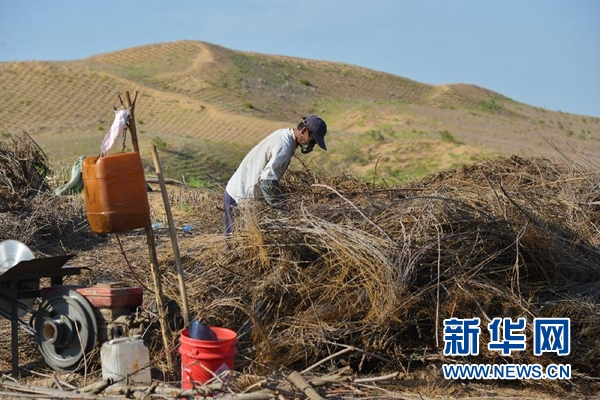 在内蒙古鄂尔多斯市杭锦旗,工人为新修的穿沙公路制作沙障(7月26日摄) 新华社记者 卢烨 摄