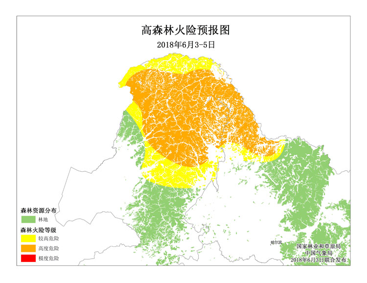 预计未来三天(2018年6月3-5日),内蒙古东北部、黑龙江西北部地区以多云局部弱阵性降雨天气为主,综合气象、林区物候及林火监测情况分析,上述地区森林火险等级仍将维持在高度危险级别,需要特别防范雷击森林火灾的发生。为此,国家林业和草原局、中国气象局特联合发布高森林火险橙色预警。