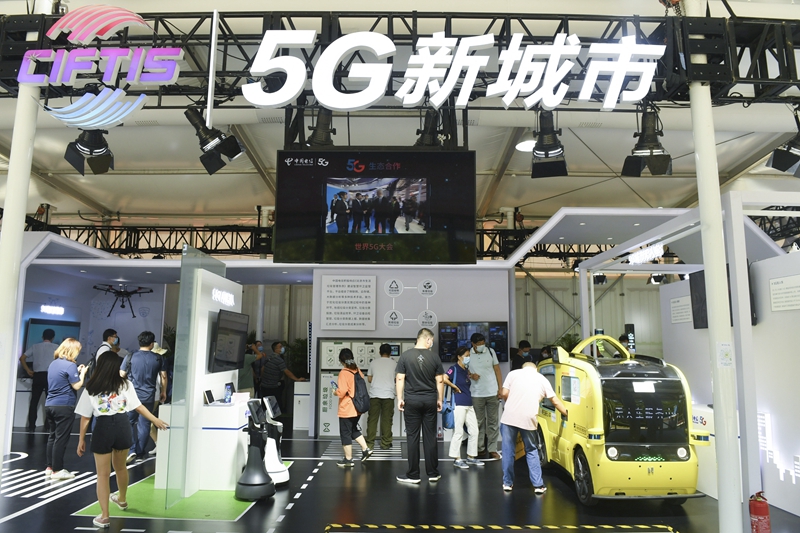 观众在2020年中国国际服务贸易交易会5G通信服务专题展区参观(2020年9月7日摄)。新华社记者 鲁鹏 摄