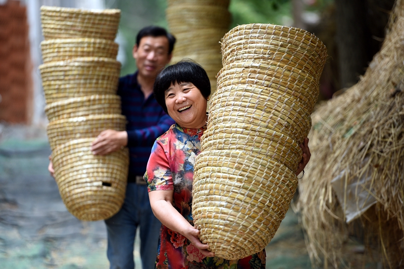 山东省临沂市郯城县马头镇草编合作社社员在搬运用秸秆编制的工艺品(2019年5月28日摄)。新华社发(房德华 摄)