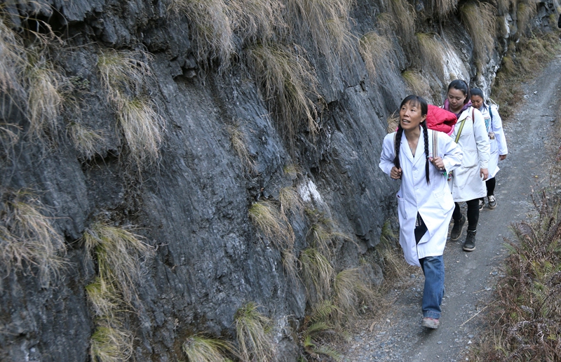 在云南省贡山县丙中洛镇,“背篓医生”管延萍(左)与同事走在进村的山路上(2019年1月13日摄)。新华社记者 张加扬 摄