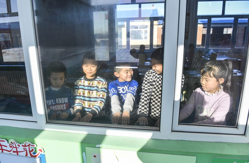 吉林省德惠市边岗乡卧虎村小学学生在户外活动后围着教室内的环流散热器取暖(2018年12月26日摄)。新华社记者 许畅 摄