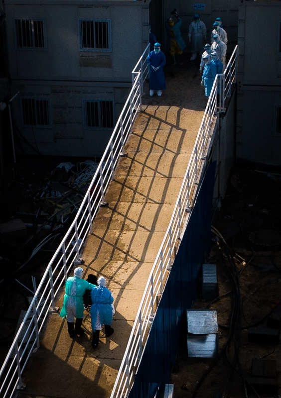 医护人员将患者送入武汉火神山医院病房(2020年2月4日摄,无人机照片)。新华社记者 肖艺九 摄
