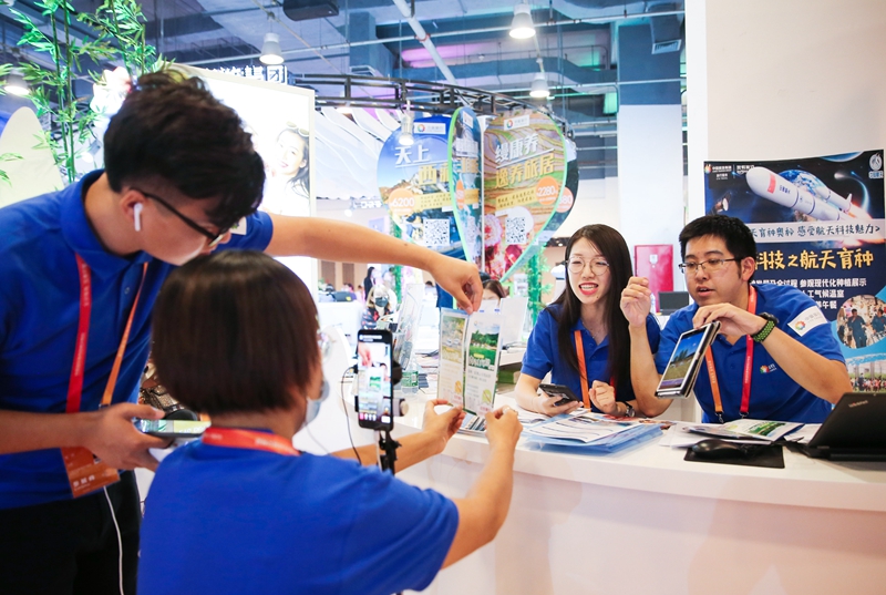 在2020年中国国际服务贸易交易会旅游服务专题展区,中国旅游集团展位的工作人员通过直播向线上观众介绍旅游服务产品(2020年9月5日摄)。新华社记者 潘思危 摄