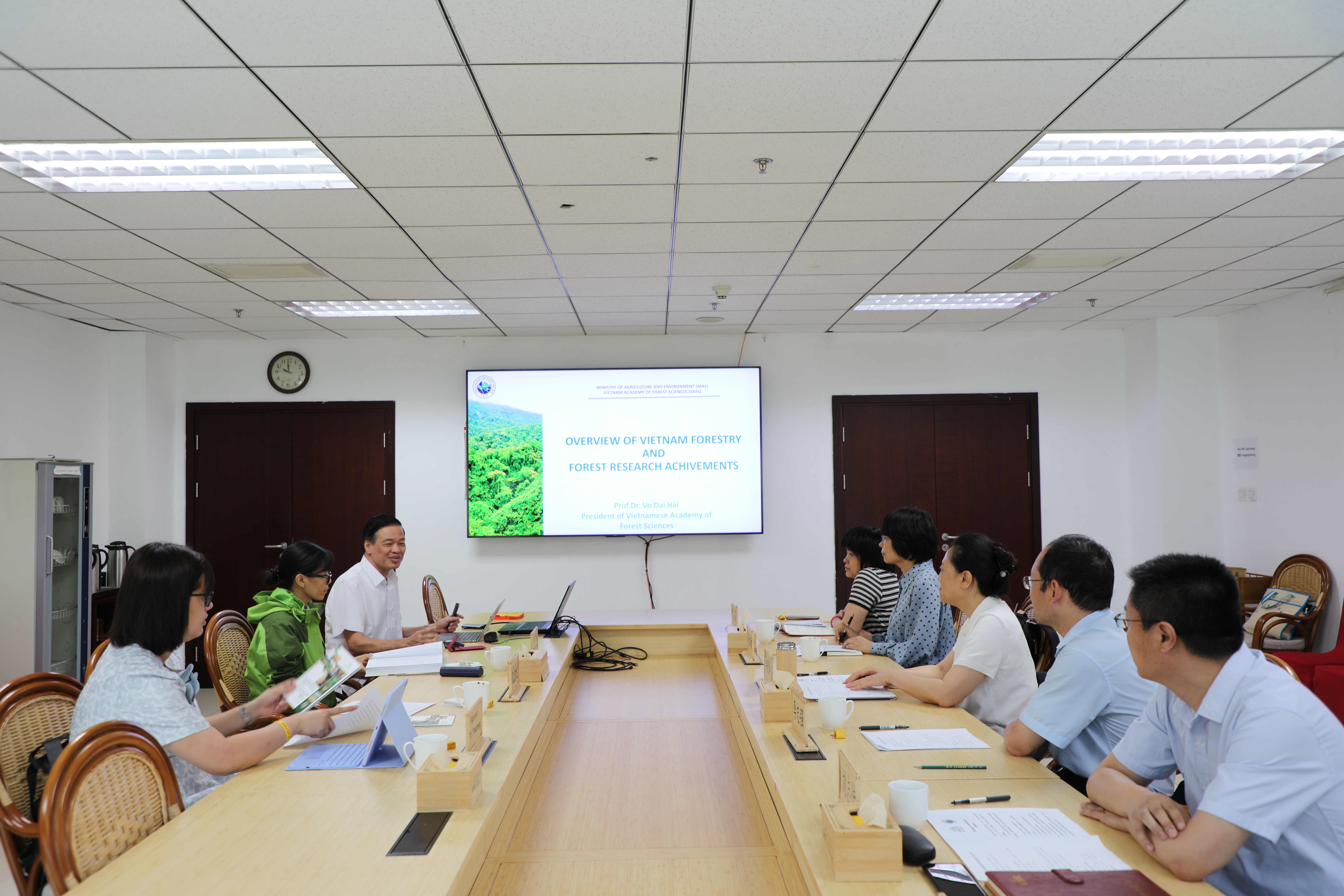 会上,Vo Dai Hai院长作了题为“越南林业及林业研究进展”的报告,介绍了越南林业的现状、面临的问题和发展方向,包括应对气候变化、碳中和、重视森林多重功能的综合性森林恢复;中心马千里博士作了题为“国际竹藤组织试点成员国以竹代塑关键技术研究与示范项目”的报告。双方就竹子选种育种、竹林高效可持续经营、竹资源遥感监测、竹子材性微观研究等方面进行了充分交流。Vo Dai Hai院长表达了期望与中心共同申请科研项目的意愿,并续签双方的合作谅解备忘录。