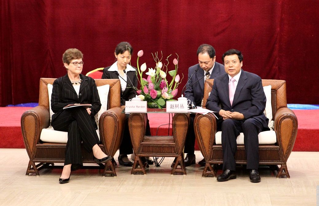 国家林业局局长赵树丛与美国农业部常务副部长克丽斯塔·哈登出席捐赠仪式,共同见证了由中国园项目中方总执行人江泽慧代表中美共建中国园项目中方执行单位、江苏英成集团董事长褚勤代表捐款企业、全美中国园基金会主席斯多曼代表全美中国园基金会三方捐赠签字仪式。仪式之前,赵树丛与克丽斯塔·哈登进行了座谈。