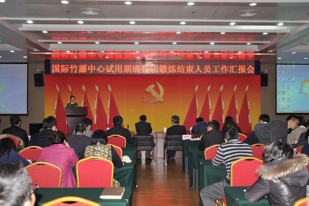 2014年12月25日,国际竹藤中心召开试用期满转正和挂职锻炼人员工作汇报会。中心常务副主任费本华、党委书记刘世荣出席会议并讲话,副主任李凤波出席会议,党委副书记李晓华主持会议,中心全体干部职工参加。