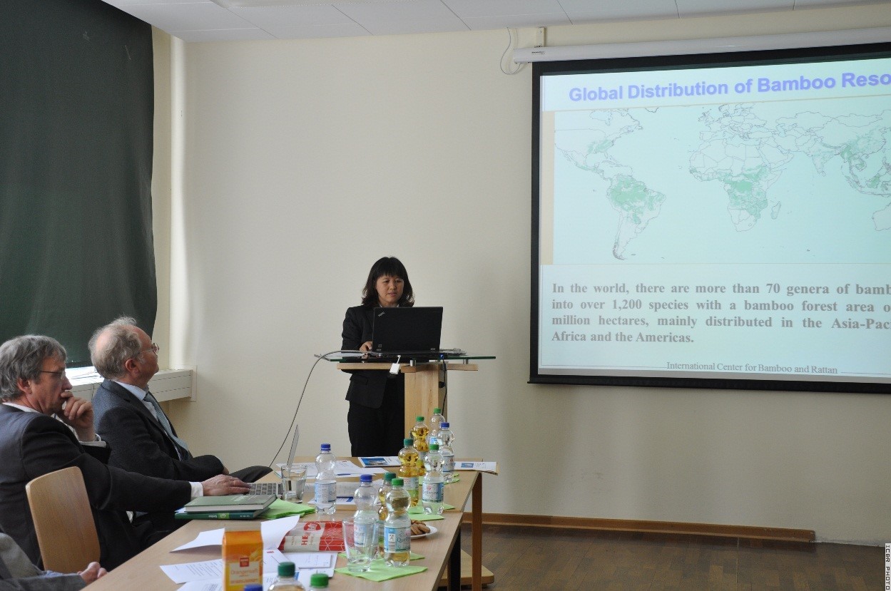 德方详细介绍了汉堡大学木材科学中心、图能木材研究所以及德方近年来执行的竹材项目等情况,虽然德方在竹原材料样本的采集、运输和防腐等过程中面临很多挑战,但希望与中方通过签署合作协议积极开展合作,从可持续发展、减缓气候变化的影响等多角度拓宽合作领域。德方还将最新出版的专著《竹材及其应用》一书赠予中方。江泽慧主任代表中方积极回应,全面介绍了竹藤中心的情况,并对双方的合作进行了展望,指定代表团中的刘杏娥研究员作为中方联络人,保持与德方合作伙伴的密切沟通。刘杏娥研究员代表中方介绍了竹藤中心最新科研成果。