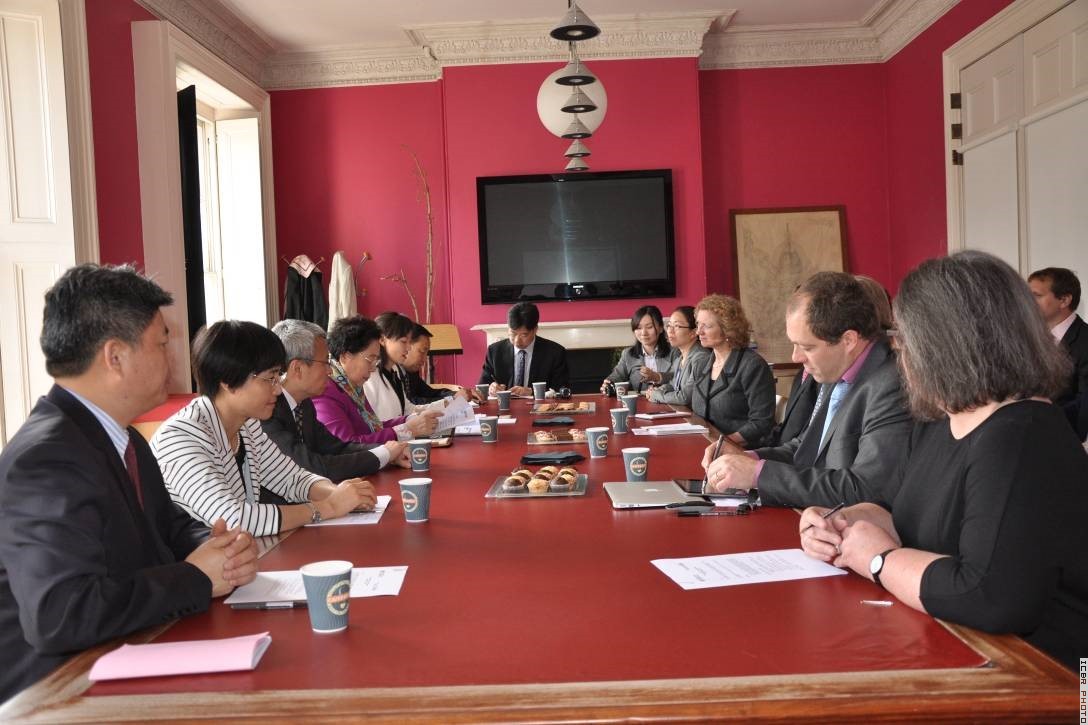 应英国剑桥大学的邀请,全国政协人口资源环境委员会副主任、国家林业局国际竹藤中心主任、国际竹藤组织董事会联合主席江泽慧率中国林业代表团一行8人,于2015年5月28日访问英国剑桥大学,受到该校副校长克里斯·亚伯(Chris Abel)、建筑学院院长温迪·普兰(Wendy Pullan)等的热烈欢迎。