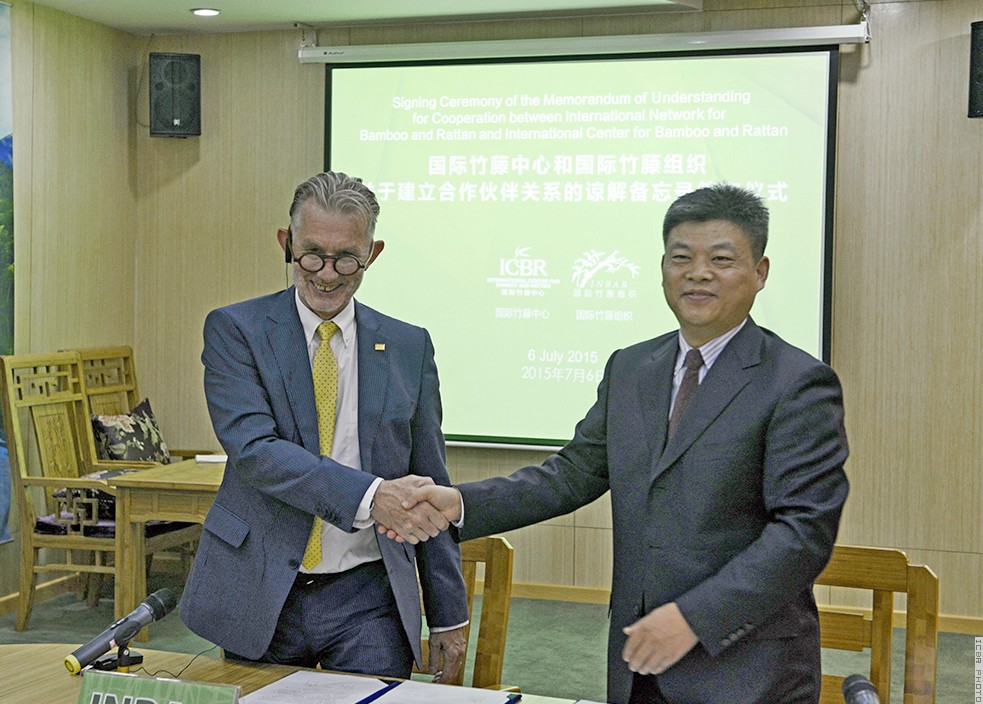 2015年7月6日,国际竹藤中心与国际竹藤组织共同签署了双方新一期合作协议。国际竹藤组织董事会联合主席、国际竹藤中心主任江泽慧和国际竹藤组织董事会主席马哈拉蒂·穆托出席签字仪式,并在现场与国际竹藤组织在海外的各位董事通过视频会议,共同见证了签字仪式。竹藤中心常务副主任费本华和国际竹藤组织总干事费翰思分别代表双方签署合作协议。