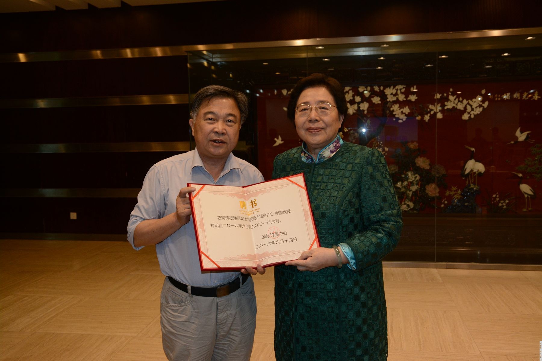会上,江泽慧主任为杨焕明院士颁发了国际竹藤中心荣誉教授证书。