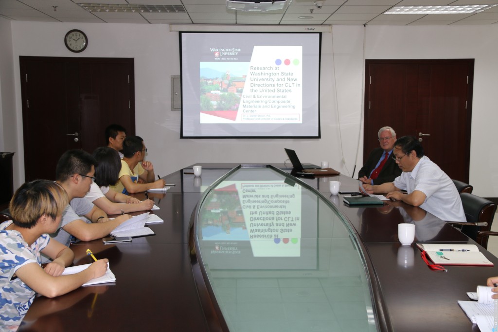 2016年6月27日美国华盛顿州立大学土木与环境工程学院J. Daniel Dolan博士来中心进行学术交流,并作了题为“跨层压木材︰制造、设计和施工”的专题报告,中心王戈研究员主持报告会,中心相关科研人员和博士生参加报告会并座谈。中心费本华常务副主任在报告前会见了J. Daniel Dolan博士,陪同参观了国际竹藤展厅,并就绿色建筑材料的研发、结构设计与施工、研究生联合培养等共同感兴趣的合作话题进行了交流。