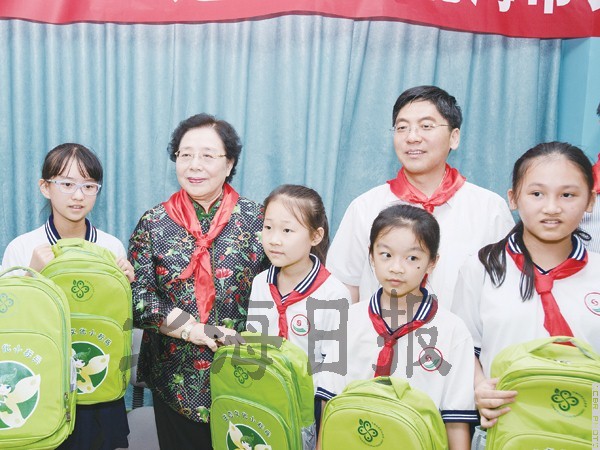 江泽慧、王可在北海实验学校参加“生态文化进校园”公益活动时与“生态文化小标兵”留影。许振国 摄