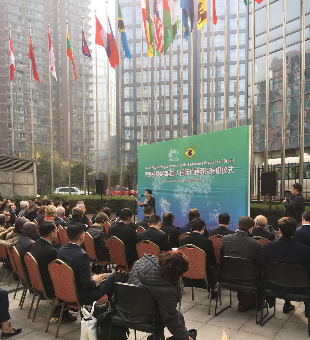 2017年11月6日,国际竹藤组织在北京总部举行巴西加入国际竹藤组织(INBAR)升旗仪式。中国全国政协人口资源环境委员会副主任、国际竹藤组织董事会联合主席、国际竹藤中心主任江泽慧,中国国家林业局副局长彭有冬,INBAR理事会主席国代表、牙买加驻华大使丘伟基,巴西国会参议院前副议长维亚纳,巴西驻华大使马尚,国际竹藤组织总干事费翰思、竹藤中心党委书记刘世荣等出席升旗仪式。