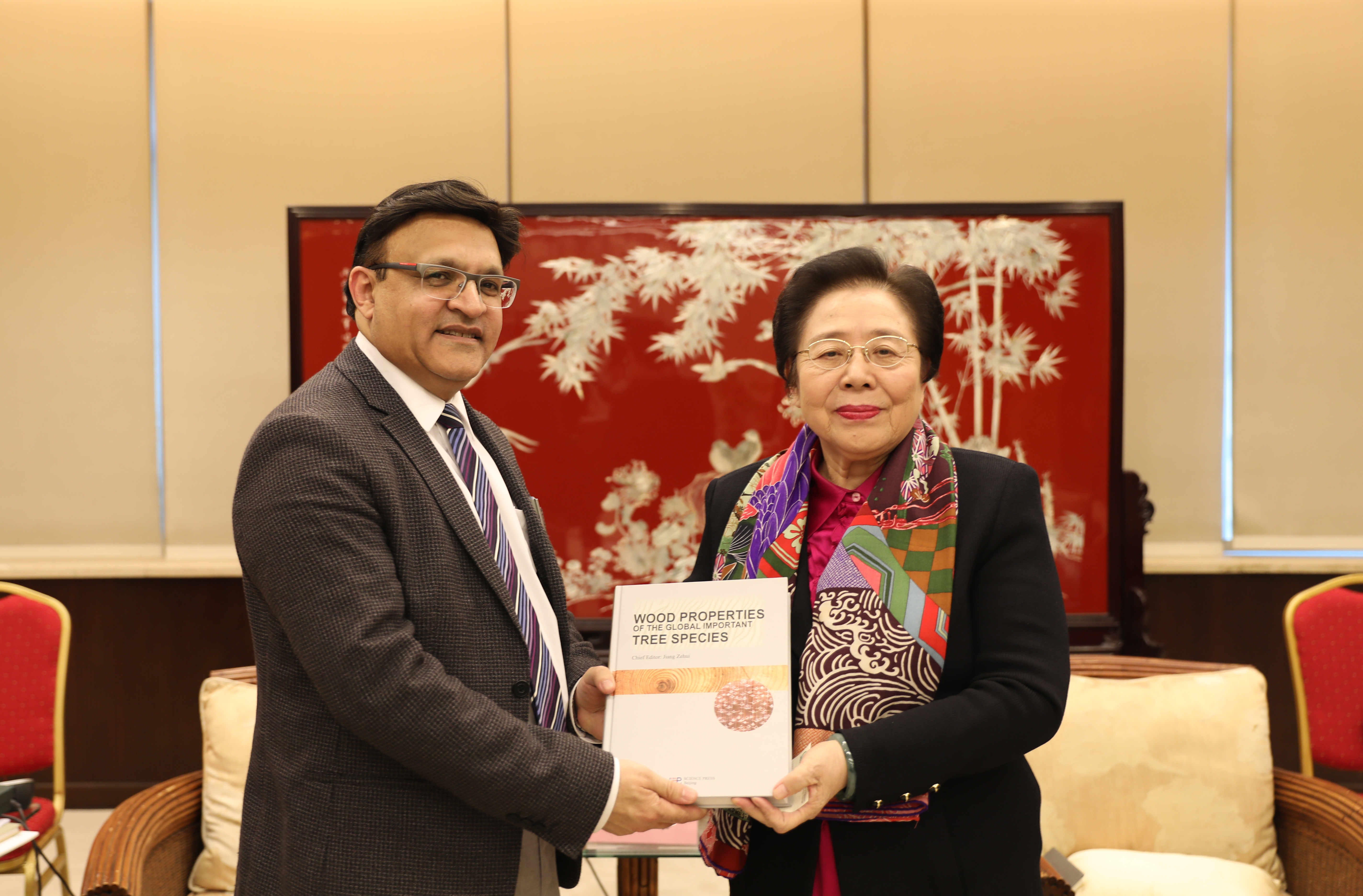2019年3月25日下午,国际竹藤组织董事会联合主席、国际竹藤中心主任江泽慧教授在北京会见了来访的巴基斯坦气候变化部国际事务联合秘书哈马德�沙密米(Hammad Shahmimi)一行。中国国家林业和草原局国际合作司副司长王春峰、国际竹藤组织副总干事陆文明参加会见。