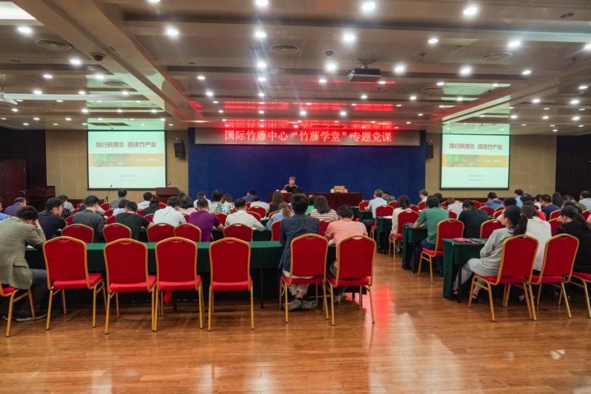 为深入贯彻落实习近平总书记在第二届“一带一路”国际合作高峰论坛开幕式上的重要讲话和在北京世界园艺博览会开幕式上的重要讲话精神,按照国际竹藤中心党委理论学习中心组2019年理论学习安排,2019年5月14日,中心举办“竹藤学堂”第二讲,由中心常务副主任、中国竹产业协会会长费本华以“践行新理念 提速竹产业”为题作专题党课。中心党委委员、副主任陈瑞国主持报告会,中心党委书记尹刚强、副主任李凤波及全体党员、职工70余人参加了党课学习。