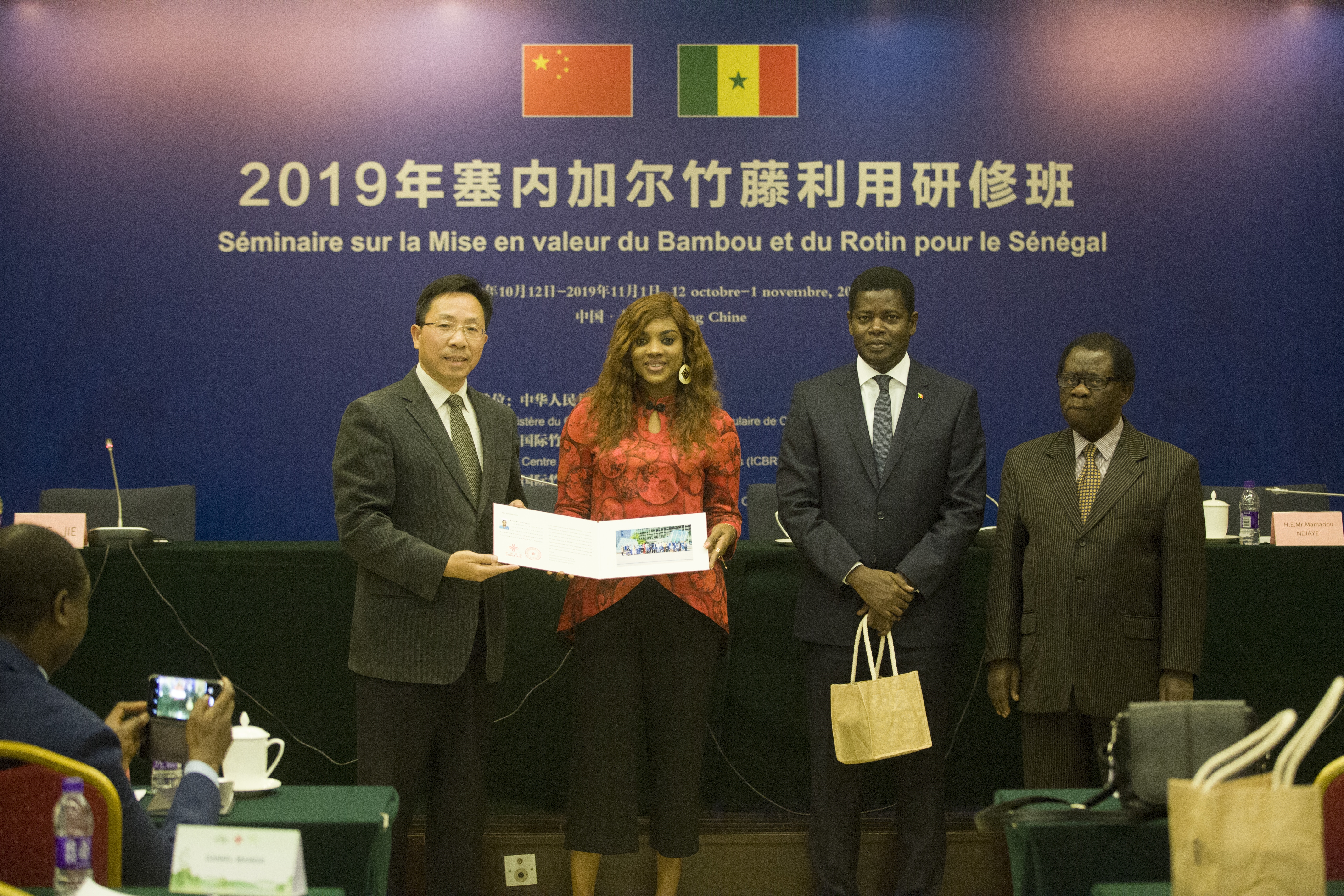 11月1日,由商务部主办、国际竹藤中心承办的“2019年塞内加尔竹藤利用研修班”在京圆满结业。来自塞内加尔的从事林业、农业、科技、标准、自然资源与环境领域相关的20名高级官员参加结业仪式。结业仪式由国际竹藤中心培训处副处长董杰主持,国际竹藤中心党委书记、副主任尹刚强,国际竹藤组织总干事阿里·穆秋姆、塞内加尔驻华大使马马杜·恩迪亚耶先生在结业典礼上致辞并向学员颁发证书。