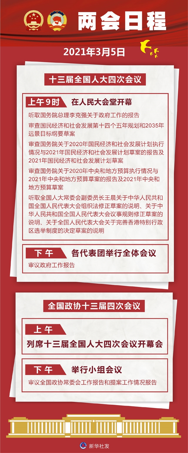 新华社北京3月4日电 十三届全国人大四次会议5日上午9时在人民大会堂开幕,听取国务院总理李克强关于政府工作的报告,审查国民经济和社会发展第十四个五年规划和2035年远景目标纲要草案,审查国务院关于2020年国民经济和社会发展计划执行情况与2021年国民经济和社会发展计划草案的报告及2021年国民经济和社会发展计划草案,审查国务院关于2020年中央和地方预算执行情况与2021年中央和地方预算草案的报告及2021年中央和地方预算草案,听取全国人大常委会副委员长王晨关于中华人民共和国全国人民代表大会组织法修正草案的说明、关于中华人民共和国全国人民代表大会议事规则修正草案的说明、关于全国人民代表大会关于完善香港特别行政区选举制度的决定草案的说明。下午,各代表团举行全体会议,审议政府工作报告。