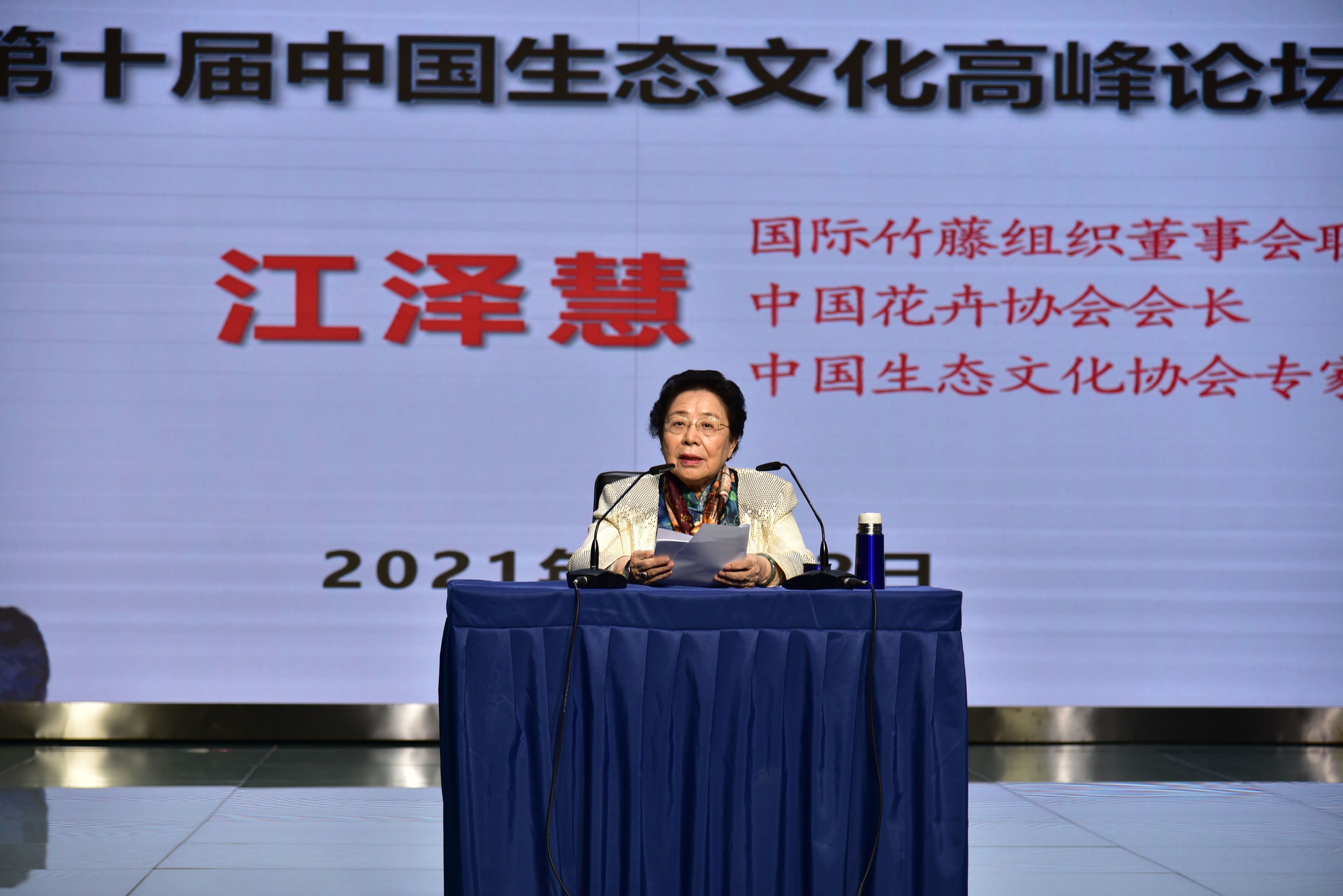 2021年5月22日上午,由中国生态文化协会和中国花卉协会主办的“第十一届中国生态文化高峰论坛”在上海市崇明区隆重举行。本届论坛的主题为“花开中国梦·花惠新生活”。全国政协常委、国家林业和草原局副局长刘东生,国际木材科学院院士、国际竹藤组织董事会联合主席、中国花卉协会会长、中国生态文化协会专家指导委员会主任委员江泽慧,上海市政协主席董云虎、副主席虞丽娟、原副主席、上海市生态文化协会会长李良园,外交部参赞、中国花卉协会副会长乐爱妹等领导和嘉宾出席了论坛。刘东生、董云虎致辞,江泽慧作主旨报告,中国生态文化协会会长刘红主持论坛。