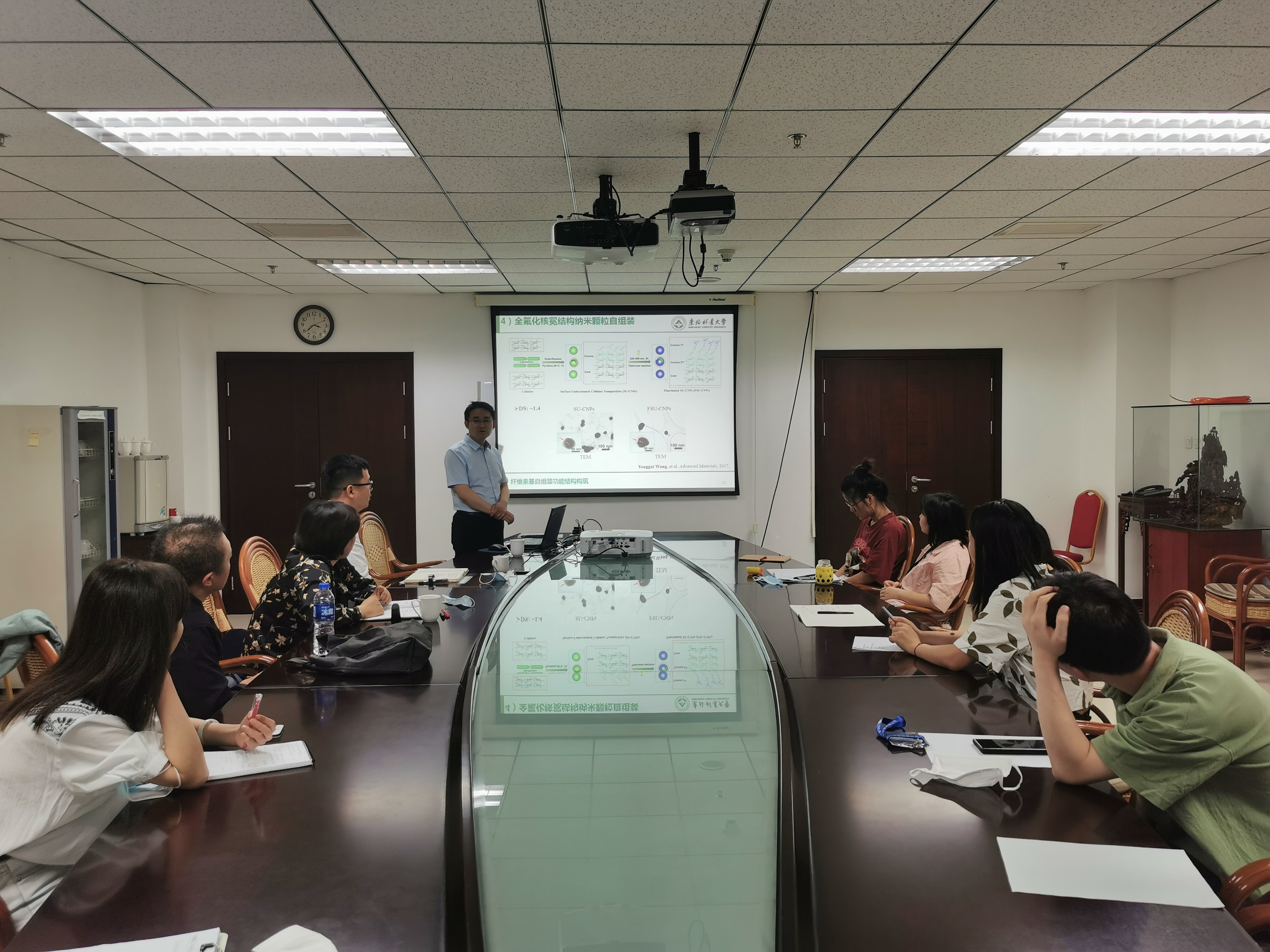 王永贵教授分别从表面酯化纤维素纳米颗粒、基于纤维素硬脂酸酯的花瓣形自组装结构、全氟化核冕结构纳米颗粒自组装以及具有相变储能性能的多功能自组装结构四个方面对纤维素基自组装材料进行了深入而细致的讲解,并与参会专家和学生就共同感兴趣的学术问题进行了深入探讨。此次学术交流为材料所科研人员及研究生了解竹纤维素基自组装材料的研究现状以及跟踪国际前沿研究进展提供了宝贵的机会,对材料所深入研究竹藤纤维素基功能材料具有很好的指导意义。