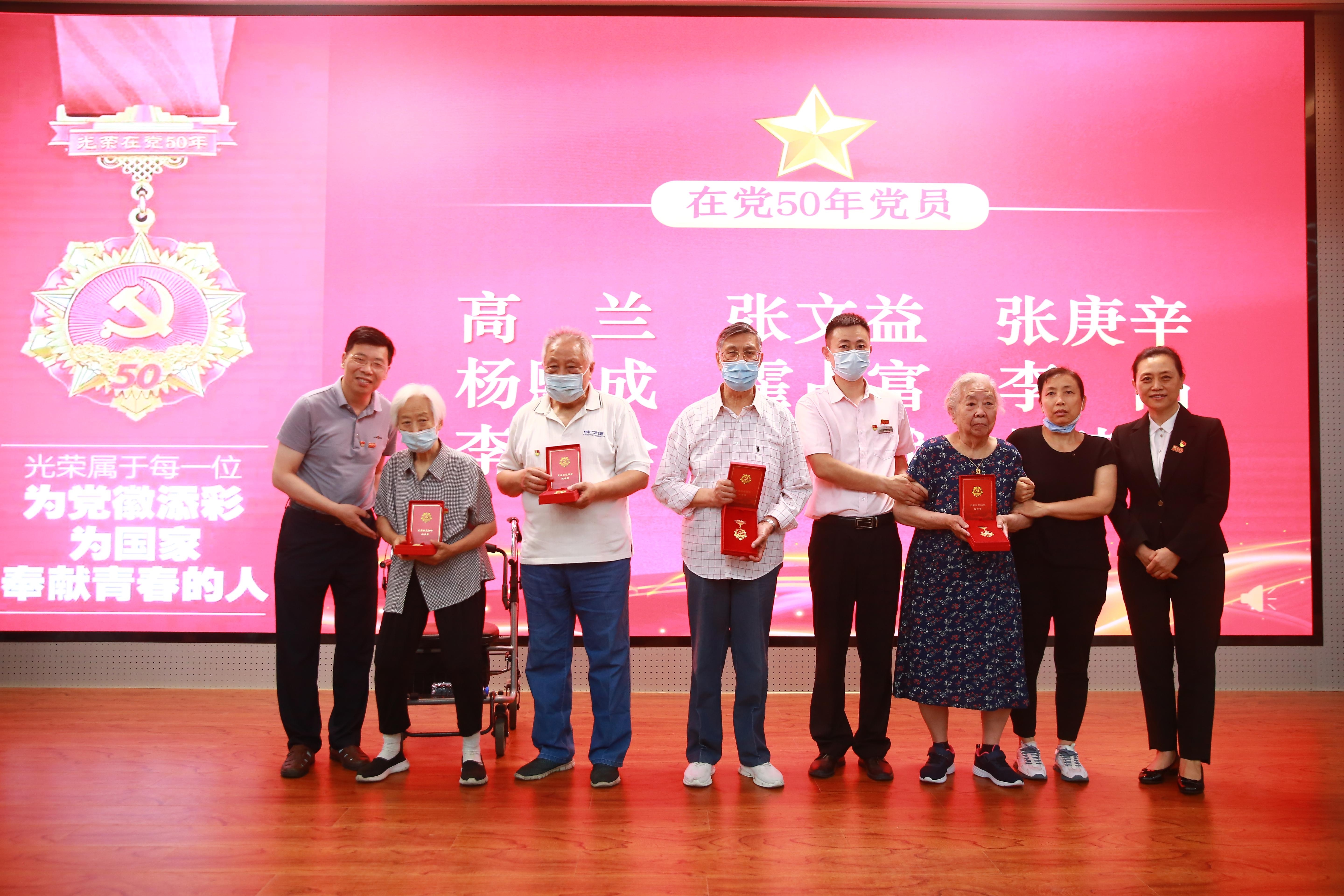 中心党委副书记、纪委书记李晓华为阜荣街社区老党员颁发“光荣在党50年”纪念章