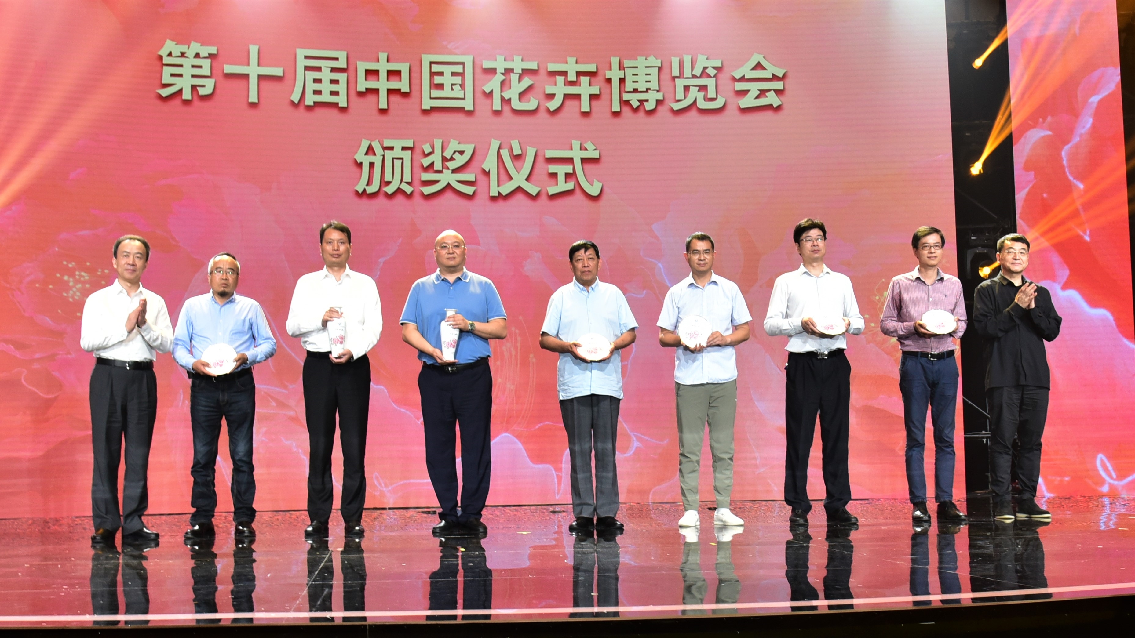 在主办方和参展单位代表发言结束后,举行了室外展园捐赠仪式,并由中国花卉协会秘书长张引潮公布了第十届中国花卉博览会的评奖结果。国际竹藤中心陈瑞国副主任为获奖者颁发了第十届中国花博会组织奖银奖;中心园林花卉与景观研究所在本届花博会中承担了竹藤馆(园)总体规划设计、科学艺术特展及跨界专业论坛等工作,获得广泛好评,荣获本届花博会特色创意奖,中心办公室主任覃道春代表中心上台领奖。