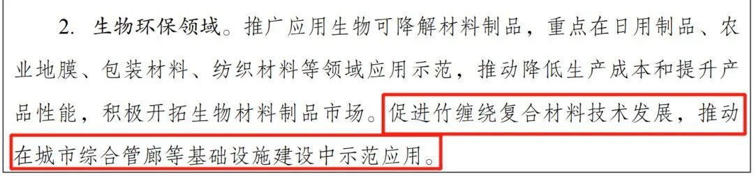 2022年5月10日,国家发改委发布《关于印发<“十四五”生物经济发展规划>的通知》。规划指出:在生物环保领域,“促进竹缠绕复合材料技术发展,推动在城市综合管廊等基础设施建设中示范应用。”