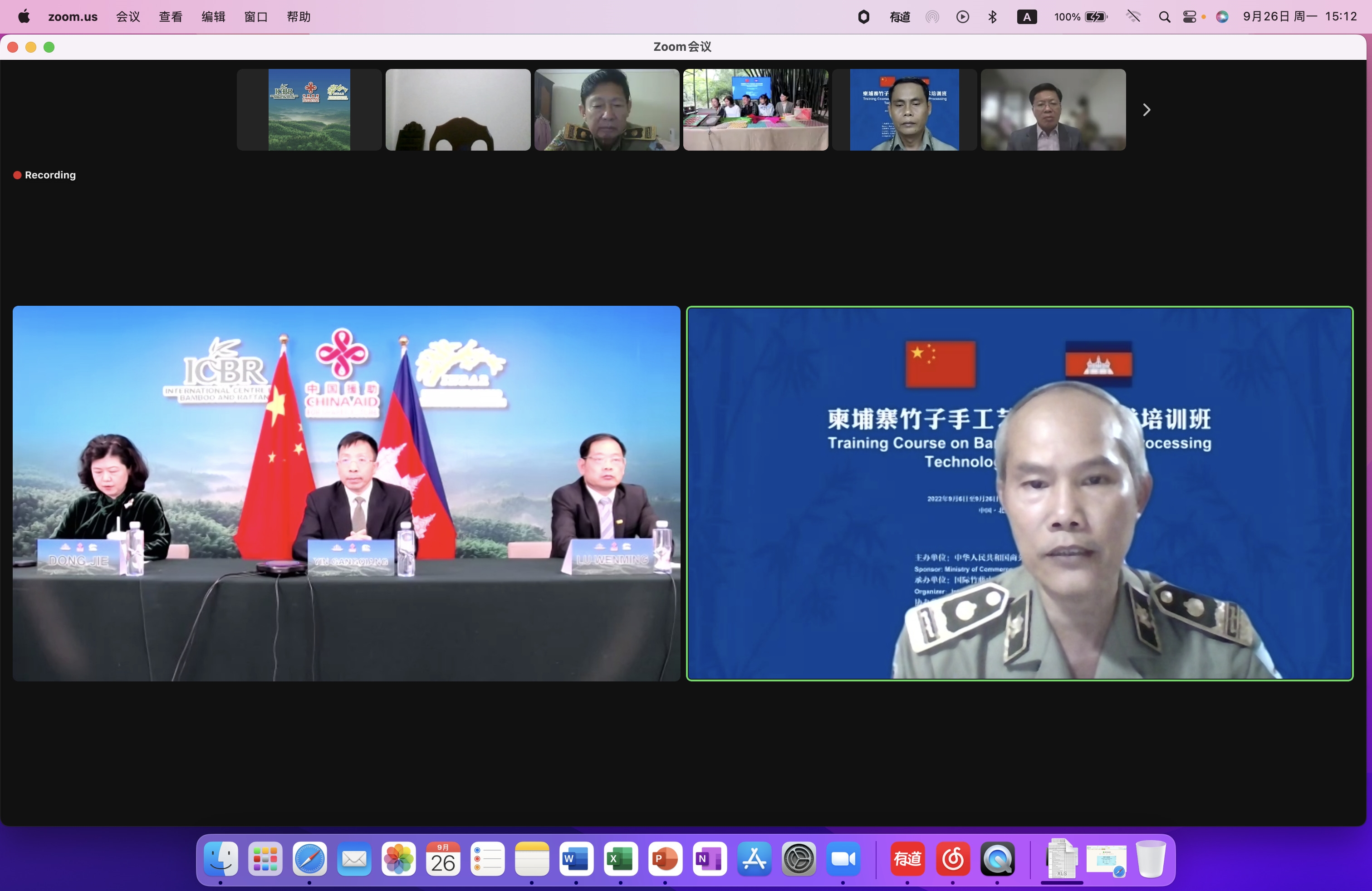 2022年9月26日,国际竹藤中心承办的“柬埔寨竹子手工艺品加工技术培训班”结业典礼在北京举行,国际竹藤中心党委书记、副主任尹刚强,国际竹藤组织副总干事陆文明出席结业典礼并讲话。国际竹藤中心培训处副处长董杰主持结业典礼。