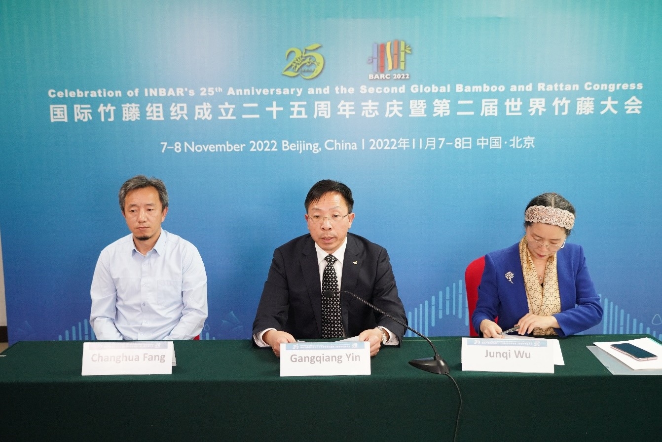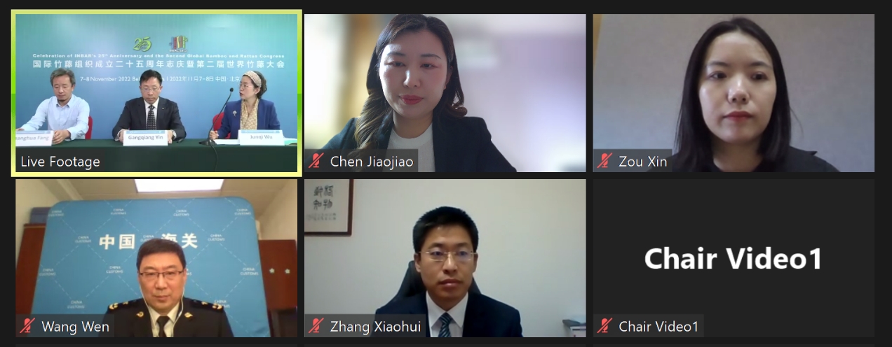 2022年11月8日下午,第二届世界竹藤大会“促进竹藤商品的贸易便利化”边会通过线上和线下相结合的方式成功举办。边会由国际竹藤组织宣传部主任吴君琦博士主持,特邀国际竹藤中心党委书记、副主任尹刚强致辞。边会邀请海关总署关税征管司王雯副司长、中国常驻世界贸易组织代表团张晓辉处长、国际竹藤中心方长华研究员、龙竹科技集团股份有限公司总经理助理邹欣以及国际竹藤中心陈娇娇博士。