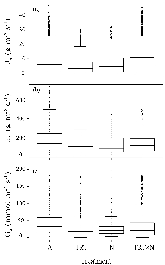图1 干旱和氮添加对毛竹液流密度(Js)、日均蒸腾量(EL)和冠层气孔导度(Gs)的影响,A为对照,TRT为减雨处理,N为氮添加处理,TRT×N为减雨×氮添加