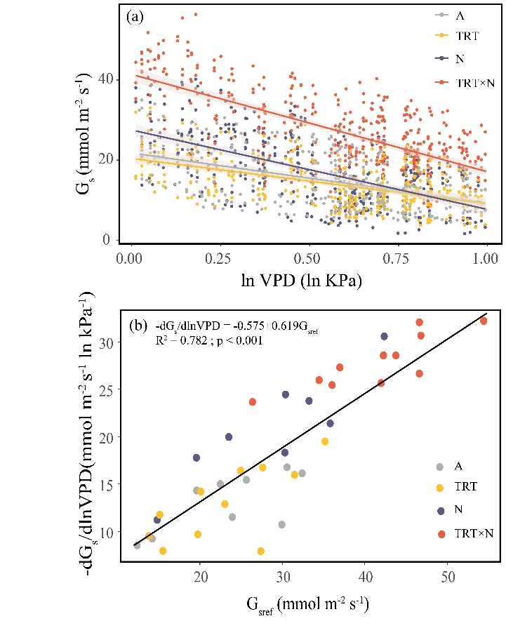 图2 干旱和氮添加对毛竹气孔导度敏感性的影响,A为对照,TRT为减雨处理,N为氮添加处理,TRT×N为减雨×氮添加
