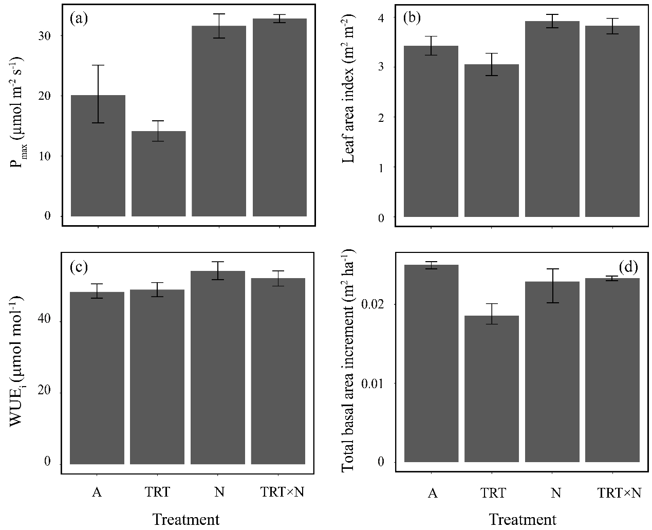 图3 干旱和氮添加对毛竹光饱和最大净光合速率(Pmax, a)、叶面积指数(b)、水分利用效率(WUEi, c)和单位样地面积断面积增量(d), A为对照,TRT为减雨处理,N为氮添加处理,TRT×N为减雨×氮添加