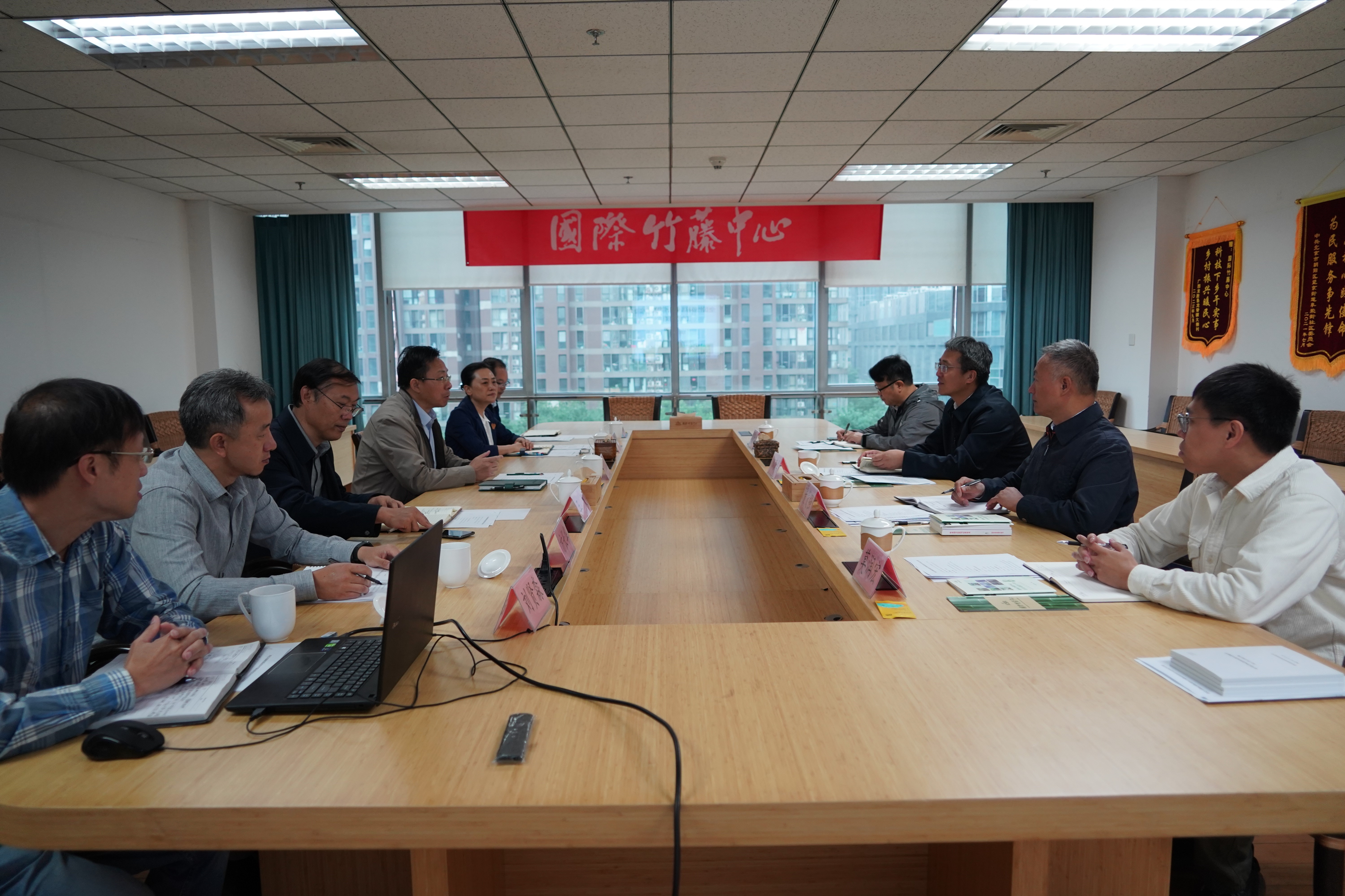 2023年10月12日,为配合第54届世界标准日主题活动,了解国家林草系统标准化技术委员会工作情况,国家林草局科技司司长郝育军、一级巡视员黄发强一行赴国际竹藤中心调研国际国内竹藤标准化技术委员会工作。国际竹藤中心党委书记、副主任尹刚强,副主任李晓华,国际竹藤中心国际处、材料所、全国竹藤标准化技术委员会(SAC/TC 263)和国际标准化组织竹藤技术委员会(ISO/TC 296)秘书处相关人员参加调研。