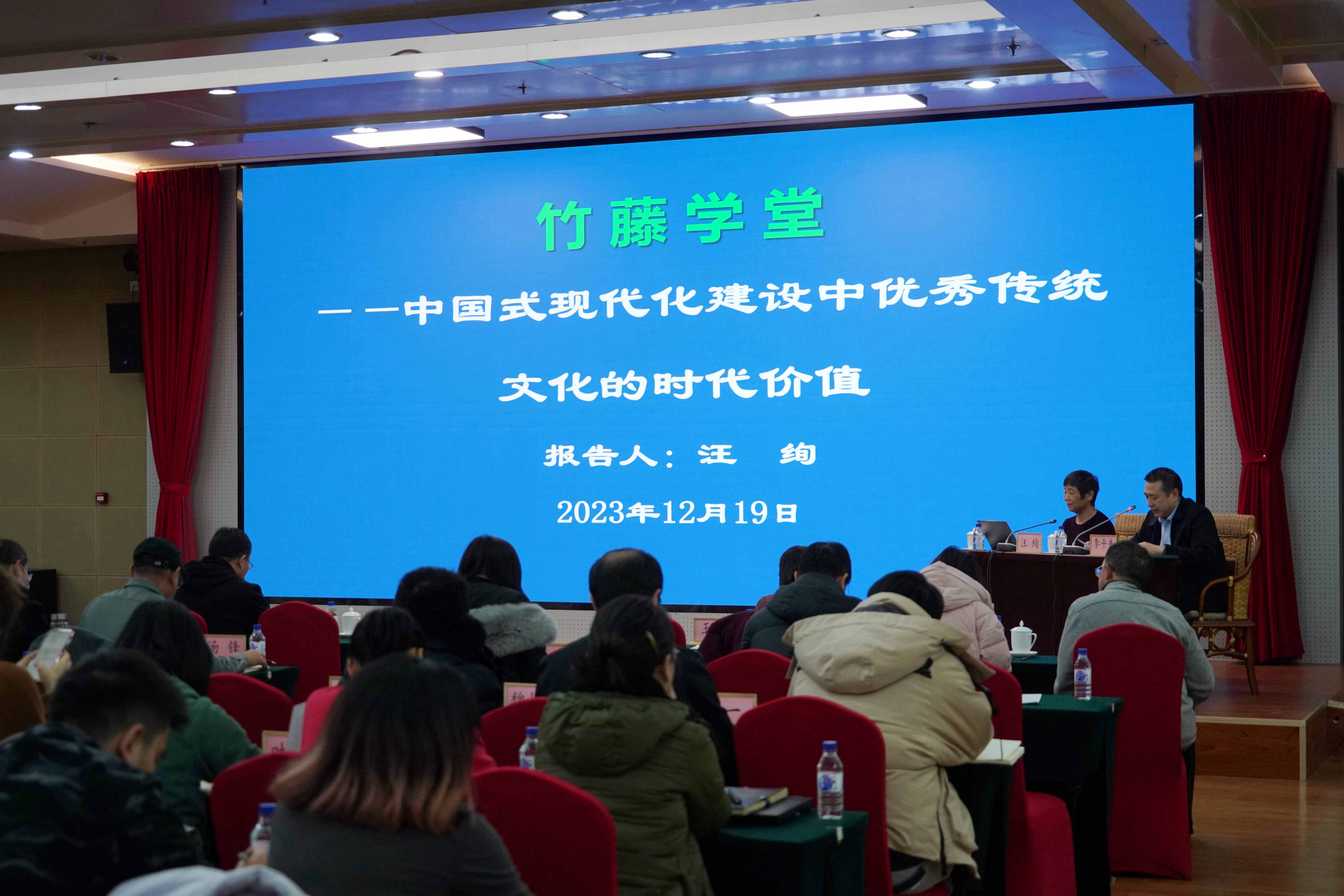 为深入学习贯彻习近平文化思想以及习近平总书记在文化传承发展座谈会上的重要讲话精神,引导中心全体党员、干部职工进一步坚定文化自信,增强文化自觉,12月19日,国际竹藤中心以线上线下相结合方式举办“竹藤学堂”专题报告,特邀中国生态文化协会专家指导委员会委员汪绚作题为《中国式现代化建设中优秀传统文化的时代价值》的辅导报告。中心党委副书记、纪委书记李平先主持会议,中心领导班子,全体党员、干部职工120余人参加学习。