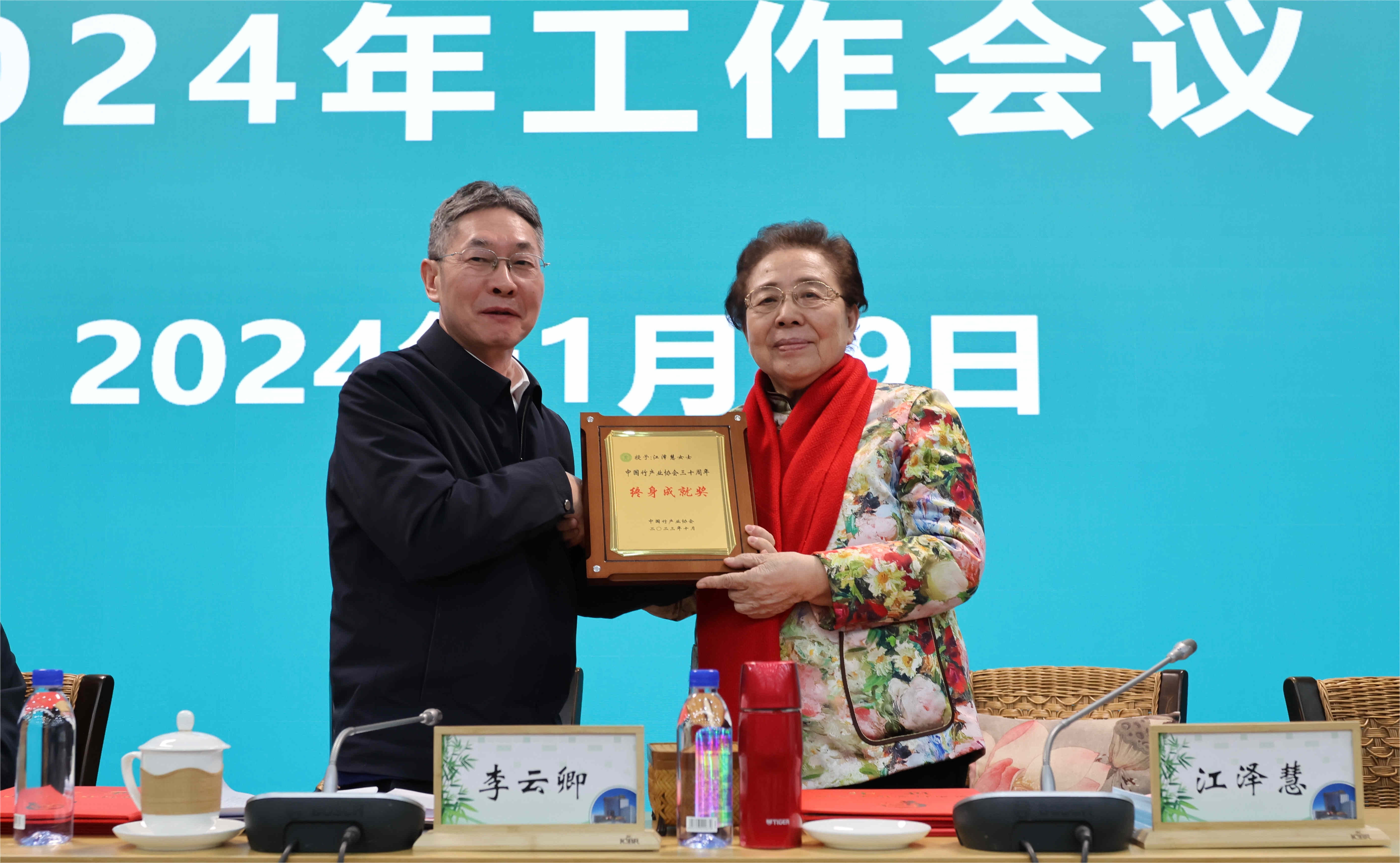 李云卿副局长为江泽慧教授颁发中国竹产业协会终身成就奖奖牌