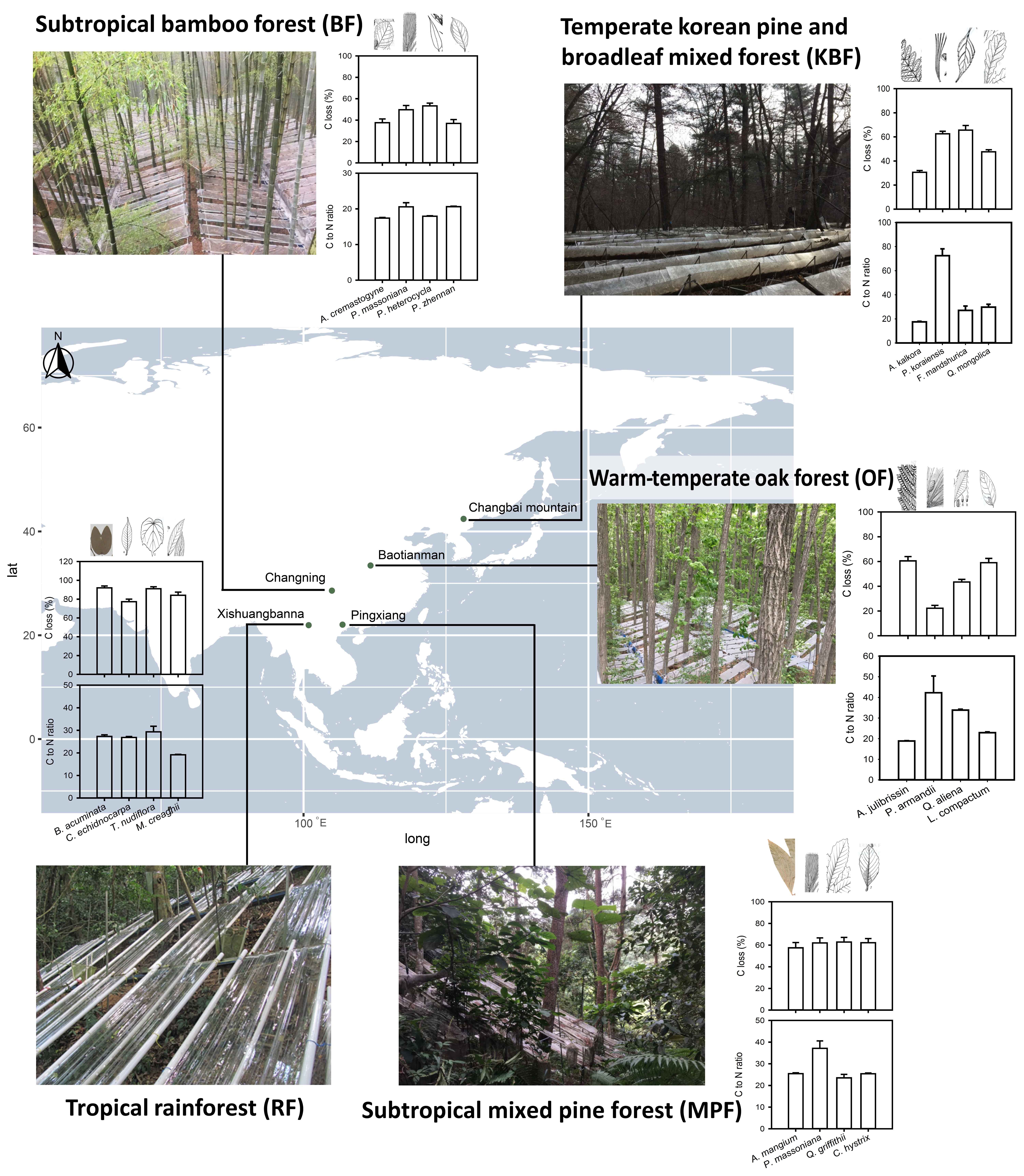 国际竹藤中心栾军伟研究员与中国林业科学研究院刘世荣院士团队联合国内外多家科研机构,利用国家林草局、中国科学院等部门在中国温带、暖温带、亚热带、热带等五个气候带生态系统定位站建立了森林模拟气候干旱联网研究平台(图1),并针对凋落物分解这一影响森林生态系统碳和养分循环的重要过程开展了系统研究。发现在不同森林类型中,与对照相比,模拟干旱条件下凋落物叶分解损失的碳和氮更少,而凋落物叶多样性和分解者群落的复杂性均缓解了干旱对生物地球化学循环的负面影响。