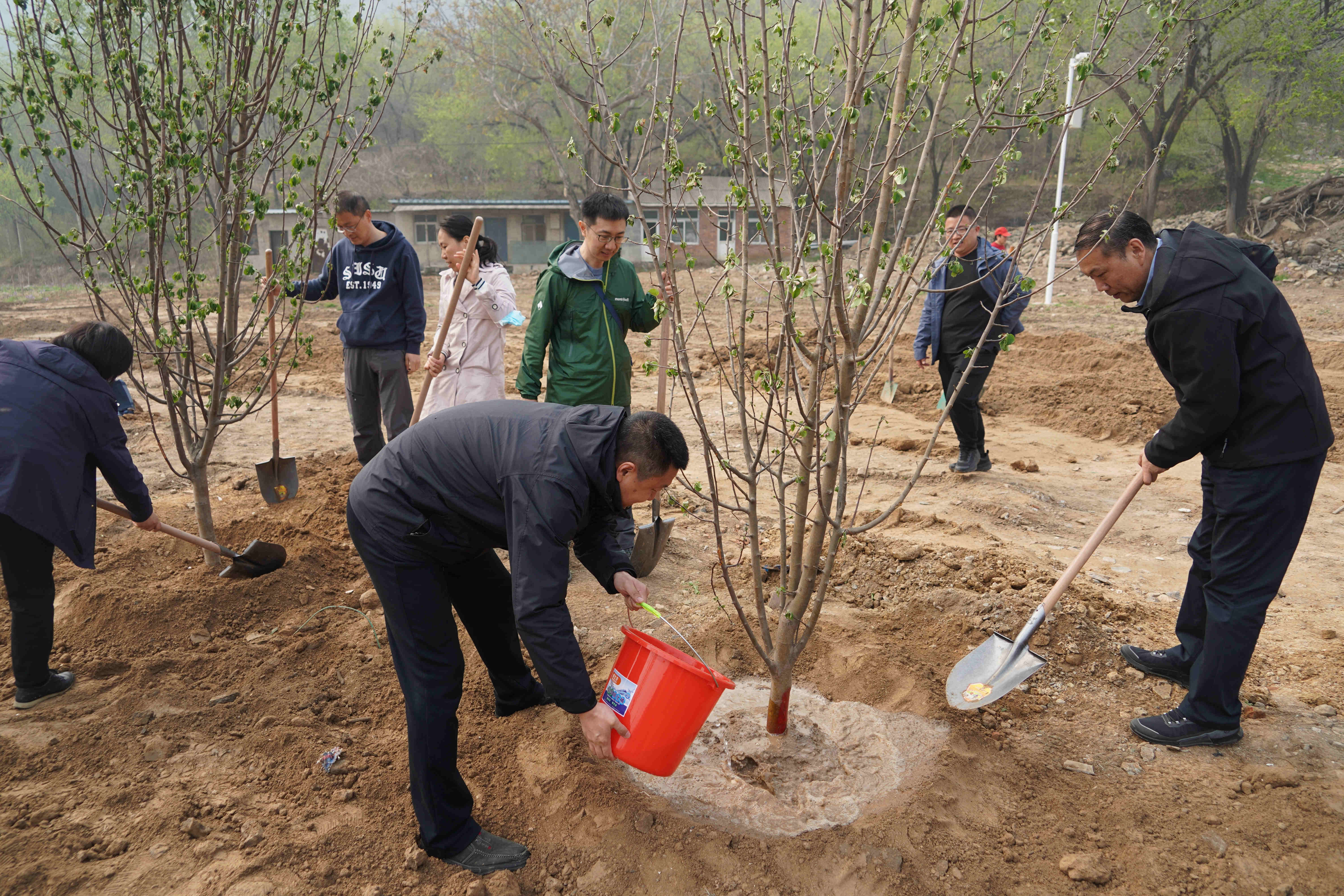 植树现场大家密切配合、干劲十足,一起扶苗培土、拎桶浇水,切实把“绿水青山就是金山银山”的生态文明发展理念付诸行动。