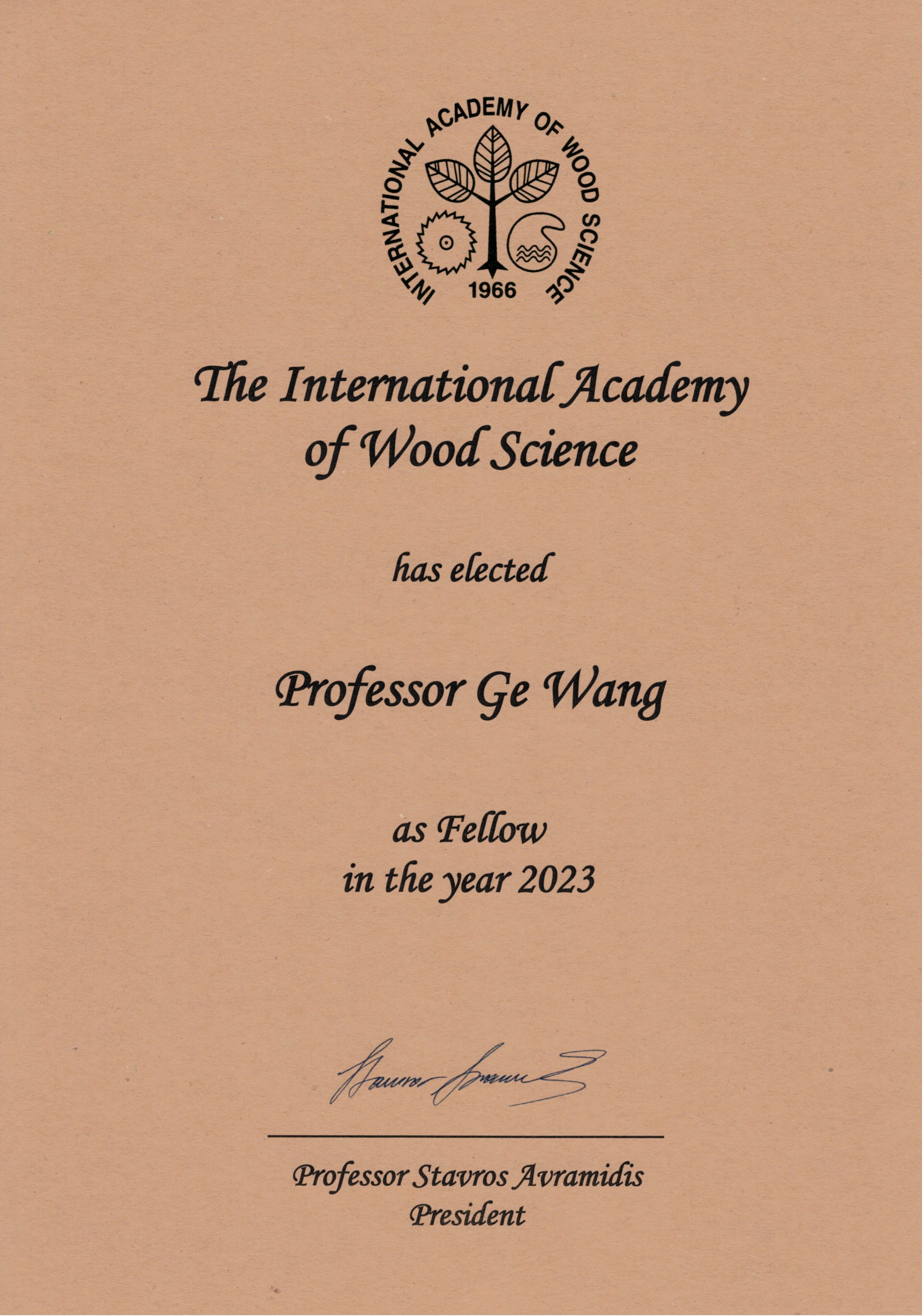 近日,国际木材科学研究院(International Academy of Wood Science, IAWS)发来证书,国际竹藤中心材料所专家王戈研究员当选为国际木材科学院院士(Fellow of International Academy of Wood Science)。国际木材科学院于1966年在德国成立,是世界上木材科学领域的最高学术组织,旨在推动世界木材科学的发展,促进世界林产品加工技术的科技进步,实现林业可持续经营进而造福人类。国际木材科学院院士是该机构最高学术荣誉称号,新院士由院士推荐,由全体院士书面审议和无记名投票选举产生,每年增选—次。截至目前,国际竹藤中心已有3名专家当选为国际木材科学院院士。