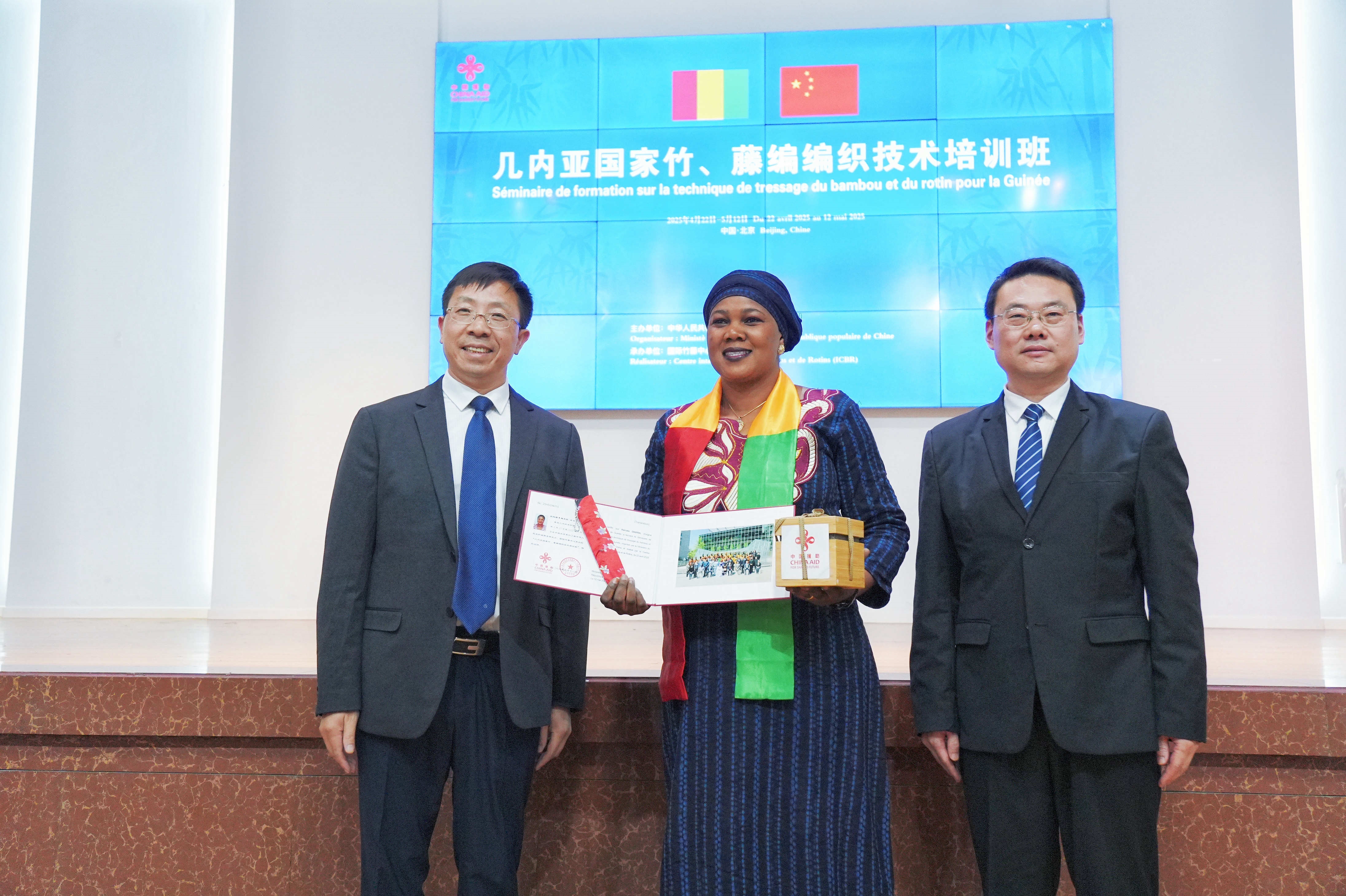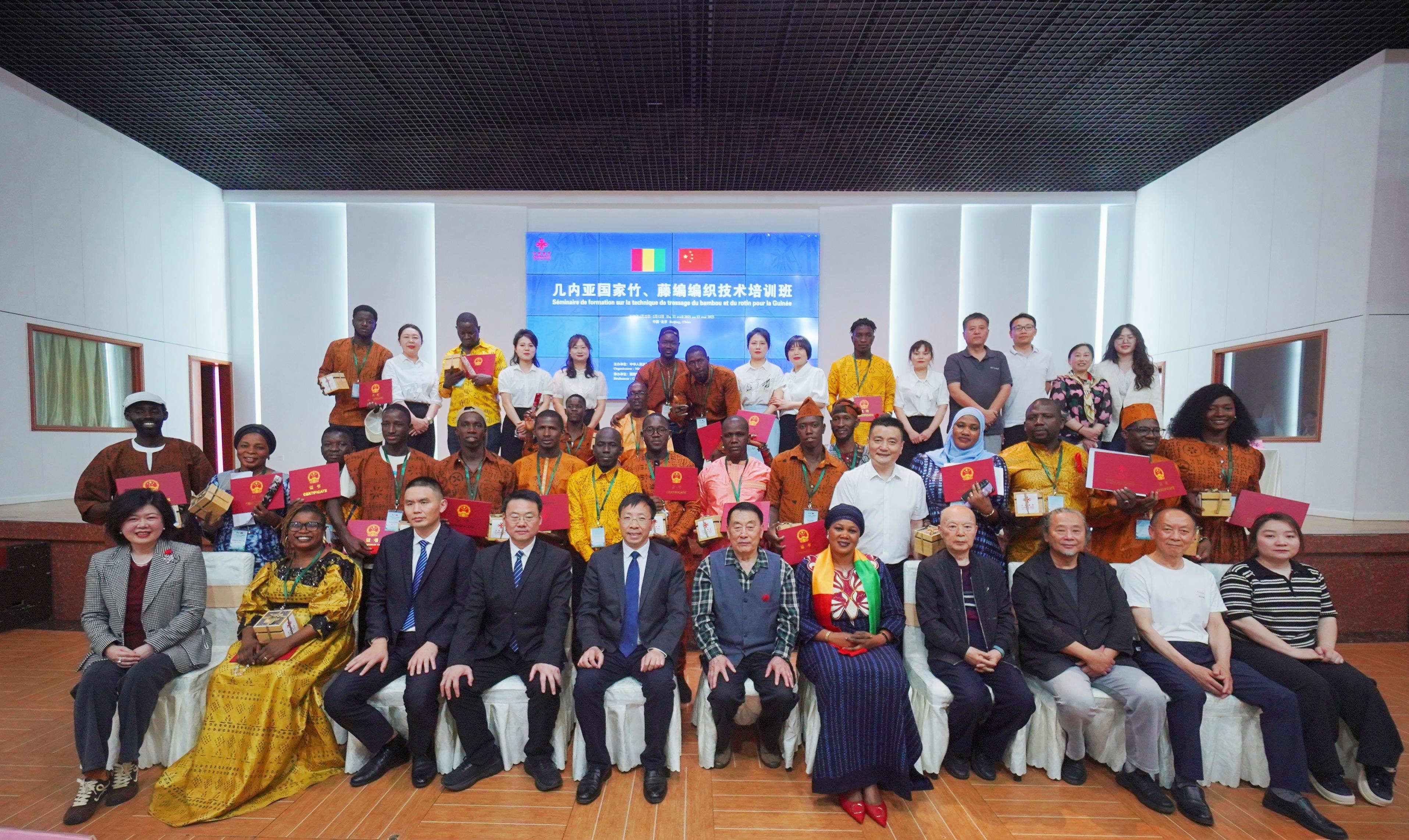 2025年5月12日,由国际竹藤中心承办的商务部“几内亚国家竹、藤编编织技术培训班”在四川青神圆满结业。国际竹藤中心党委书记、副主任尹刚强,四川省眉山市林业局党组书记、局长骆仕明结业典礼并讲话。国际竹藤中心培训处副处长董杰主持结业典礼。