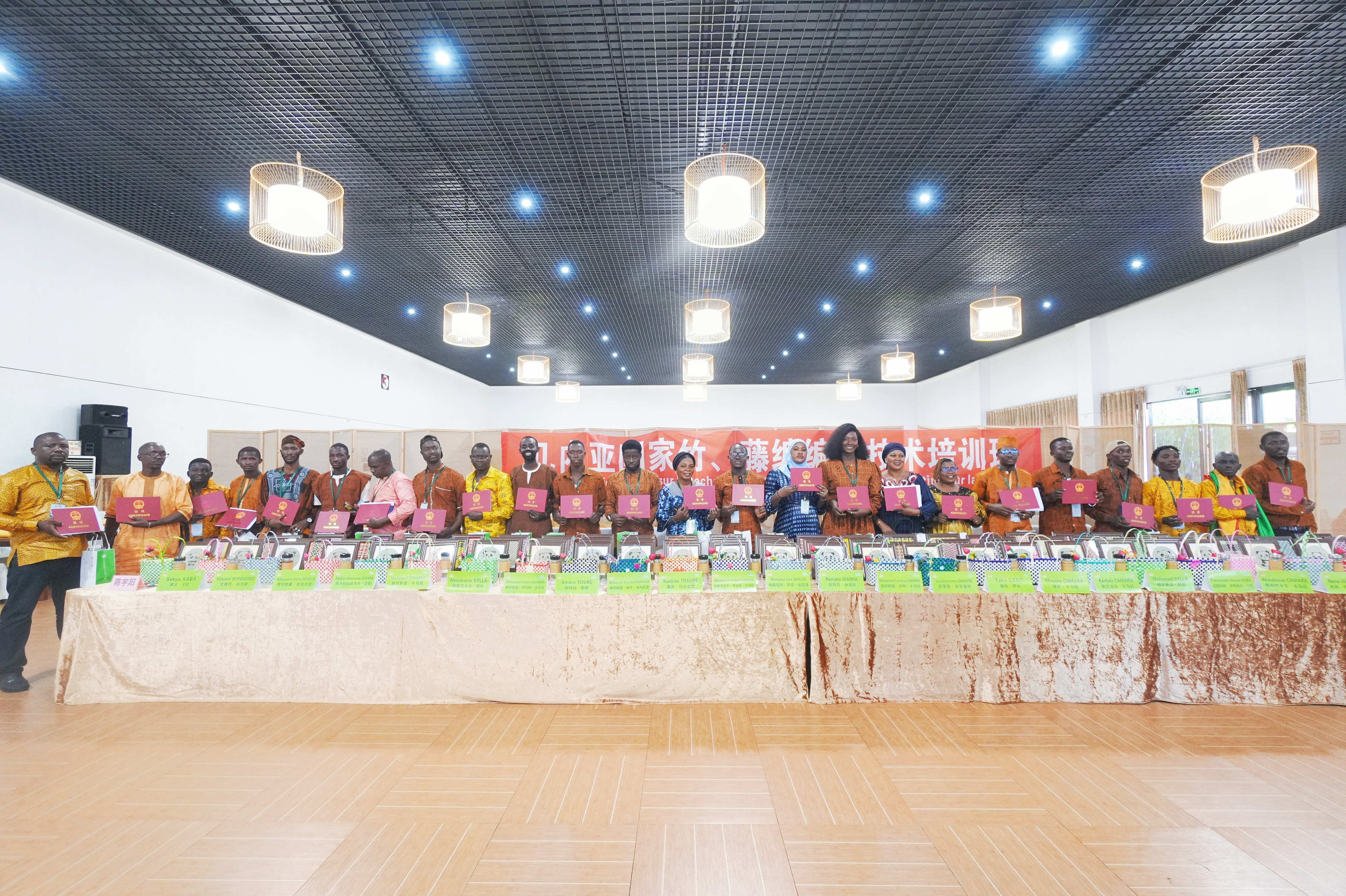 本次培训班学习内容丰富,培训成效显著。中心紧密围绕培训主题,安排了中国国情、习近平生态文明思想、竹文化与生活、中国竹产业政策、中国竹编工艺概要介绍等4堂基础理论讲座,并通过17场竹编及竹文化课堂讲座交流、12节现场教学、11节竹编实践操作,教授学员们平面竹编、立体竹编、瓷胎竹编技艺。培训期间还安排了2次文化体验和6次参观考察,举办篮球友谊赛、联欢会、学说中国话、学唱中国歌、学诵古诗词等一系列活动,让学员们在学习竹编技艺的同时,感受了中国的传统文化、风景名胜和发展成就。培训期间,24名几内亚学员共编织完成了3大类168件精美的竹编工艺品。本次培训班极大地提高了学员们对竹藤资源利用和应用的认识,增强了加工利用能力,提升了生产高质量、高附加值竹藤产品的技术与水平,对促进几内亚竹产品特别是竹编产品的开发和绿色可持续发展发挥了积极作用。